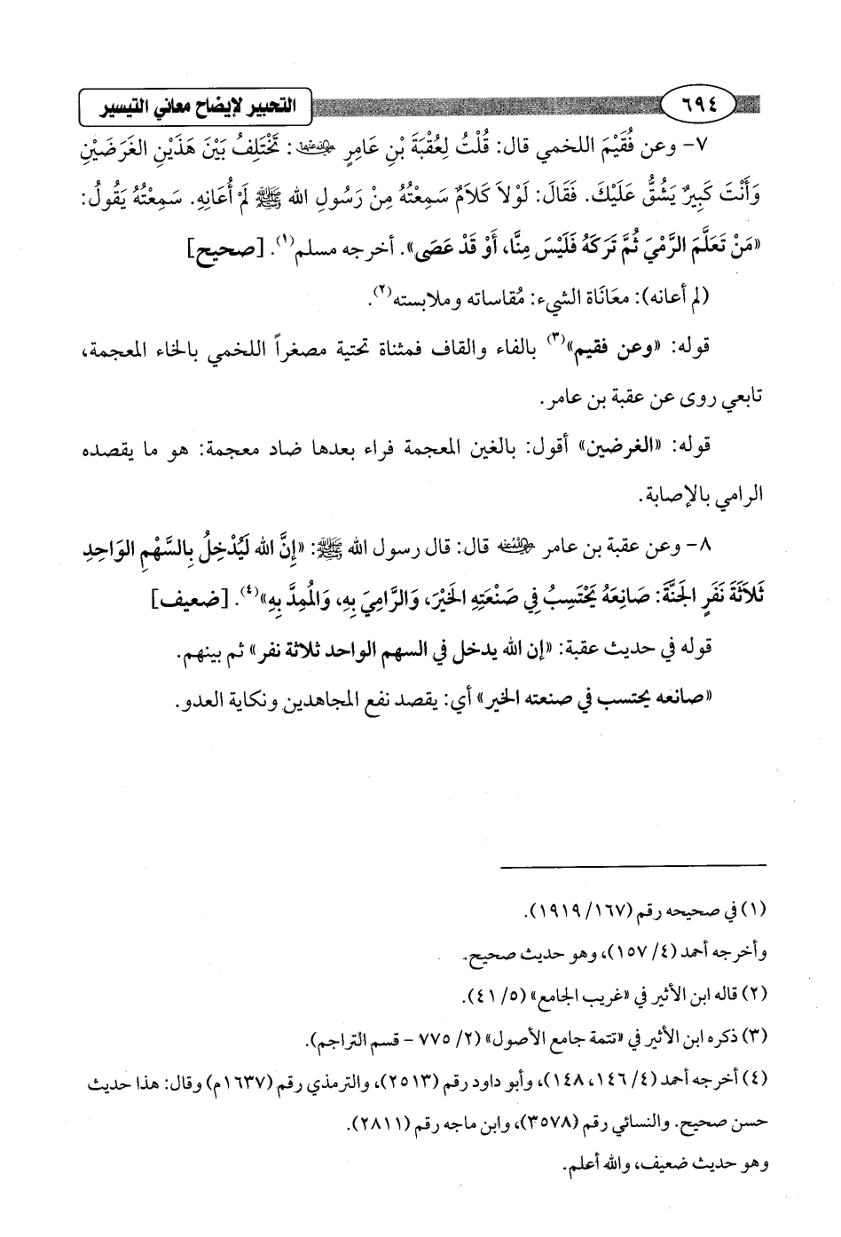 8 - وعن عقبة بن عامر - رضي الله عنه - قال: قال رسول الله - صلى الله عليه وسلم -: "إِنَّ الله لَيُدْخِلُ بِالسَّهْمِ الوَاحِدِ ثَلَاَثةَ نَفَرٍ الجَنَّةَ: صَانِعَهُ يَحْتَسِبُ فِي صَنْعَتِهِ الَخيْرَ، وَالرَّامِيَ بِهِ، وَالمُمِدَّ به" (¬4). [ضعيف]