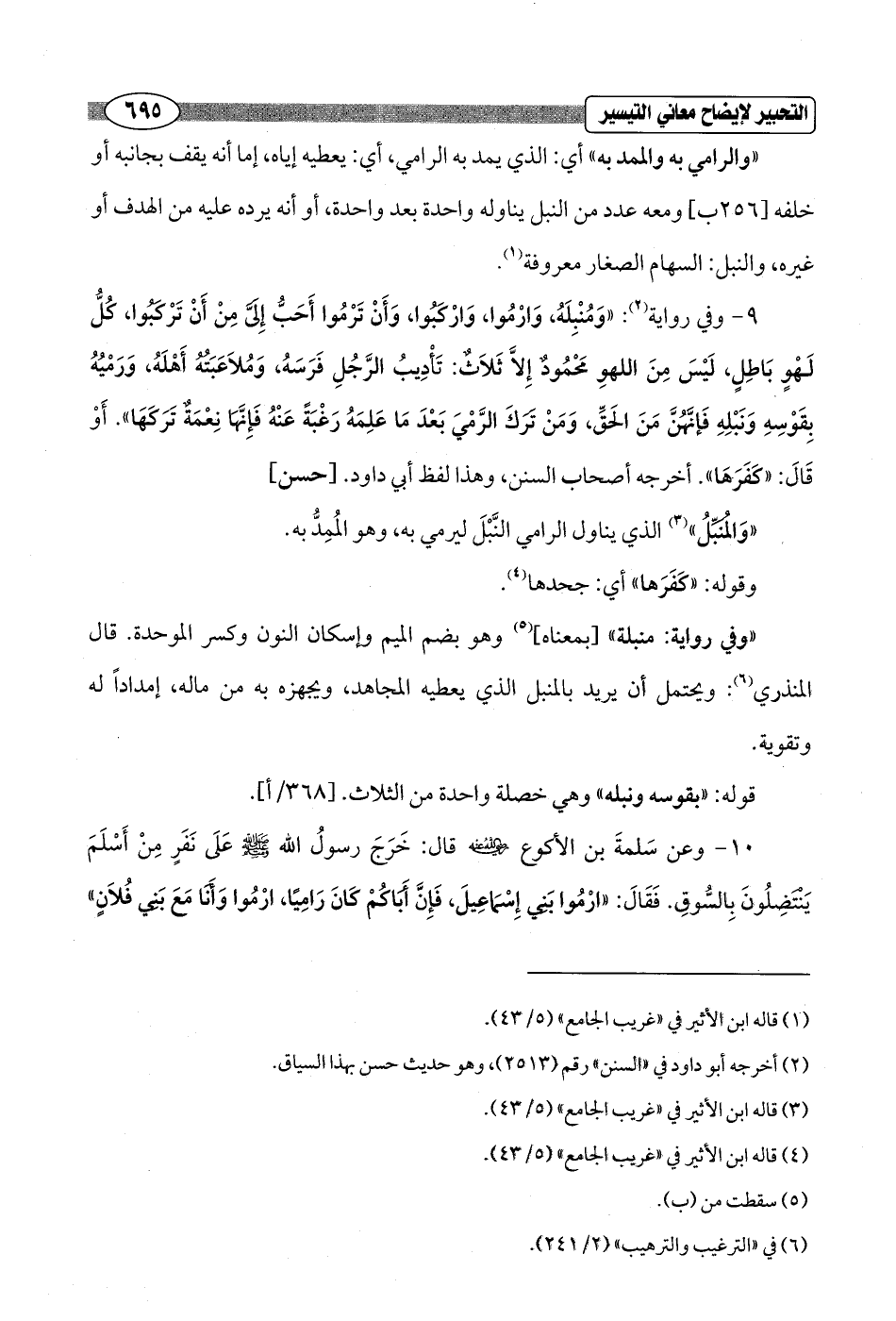 "والرامي به والممد به" أي: الذي يمد به الرامي، أي: يعطيه إياه، إما أنه يقف بجانبه أو خلفه [256 ب] ومعه عدد من النبل يناوله واحدة بعد واحدة, أو أنه يرده عليه من الهدف أو غيره، والنبل: السهام الصغار معروفة (¬1).