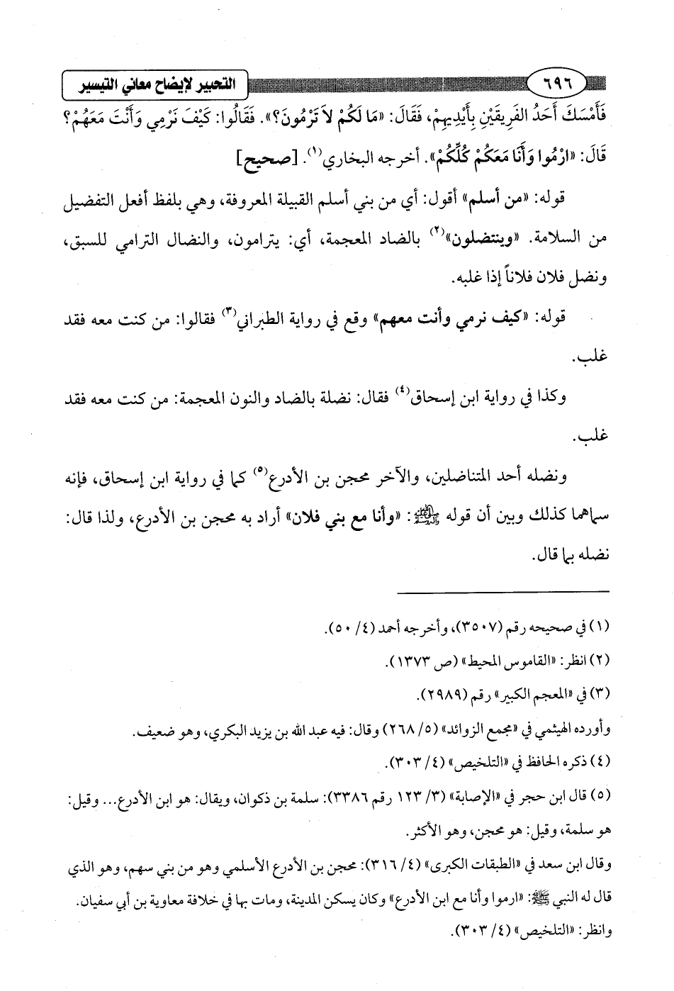 ونضله أحد المتناضلين، والآخر محجن بن الأدرع (¬5) كما في رواية ابن إسحاق، فإنه سماهما كذلك وبين أن قوله - صلى الله عليه وسلم -: "وأنا مع بني فلان" أراد به محجن بن الأدرع، ولذا قال: نضله بما قال.