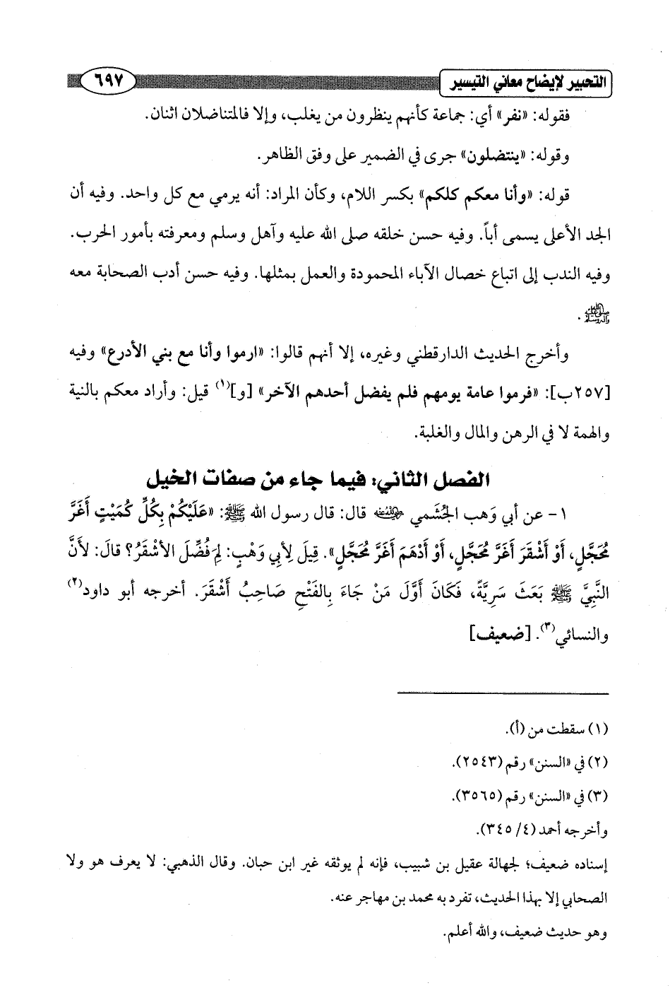 1 - عن أبي وَهب الجُشَمي - رضي الله عنه - قال: قال رسول الله - صلى الله عليه وسلم -: "عَليْكُمْ بِكُلِّ كُمَيْتٍ أَغَرَّ مُحَجَّلٍ، أَوْ أَشْقَرَ أَغَرَّ مُحَجَّلٍ، أَوْ أَدْهَمَ أَغَرَّ مُحَجَّلٍ". قِيلَ لِأبِي وَهْبٍ: لِمَ فُضِّلَ الأشْقَرُ؟ قَالَ: لأَنَّ النَّبِيَّ - صلى الله عليه وسلم - بَعَثَ سَرِيَّةً، فَكَانَ أَوَّلَ مَنْ جَاءَ بِالفَتْحِ صَاحِبُ أَشْقَرَ. أخرجه أبو داود (¬2) والنسائي (¬3). [ضعيف]