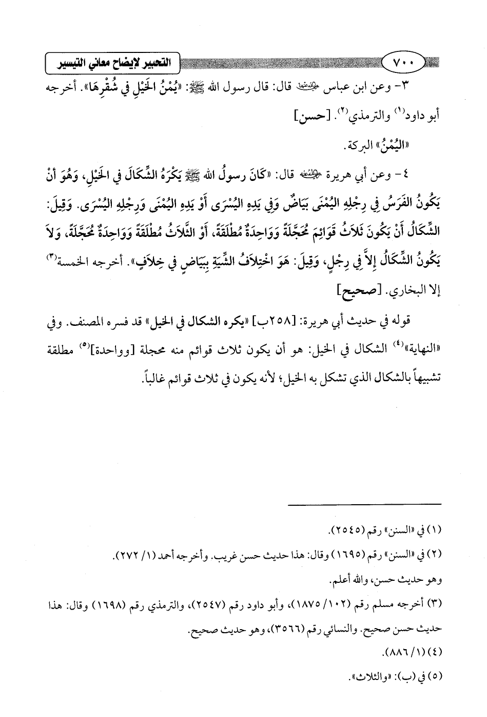 4 - وعن أبي هريرة - رضي الله عنه - قال: "كَانَ رسولُ الله - صلى الله عليه وسلم - الشِّكَالَ في الخَيْلِ، وَهُوَ أنْ يَكُونُ الفَرَسُ فِي رِجْلِهِ اليُمْنَى بَيَاضٌ وَفِي يَدِهِ اليُسْرَى أَوْ يَدِهِ اليُمْنَى وَرِجْلِهِ اليُسْرَى. وَقِيلَ: الشِّكَالُ أَنْ يَكُونَ ثَلاَثُ قَوَائِمَ مُحَجَّلَةً وَوَاحِدَةٌ مُطْلَقَةً، أَوْ الثَّلاَثُ مُطْلَقَةً وَوَاحِدَةٌ مُحَجَّلَةً، وَلاَ يَكُونُ الشِّكَالُ إِلاَّ فِي رِجْلٍ، وَقِيلَ: هَوَ اخْتِلاَفُ الشِّيَةِ بِبَيَاضٍ في خِلاَفٍ". أخرجه الخمسة (¬3) إلا البخاري. [صحيح]