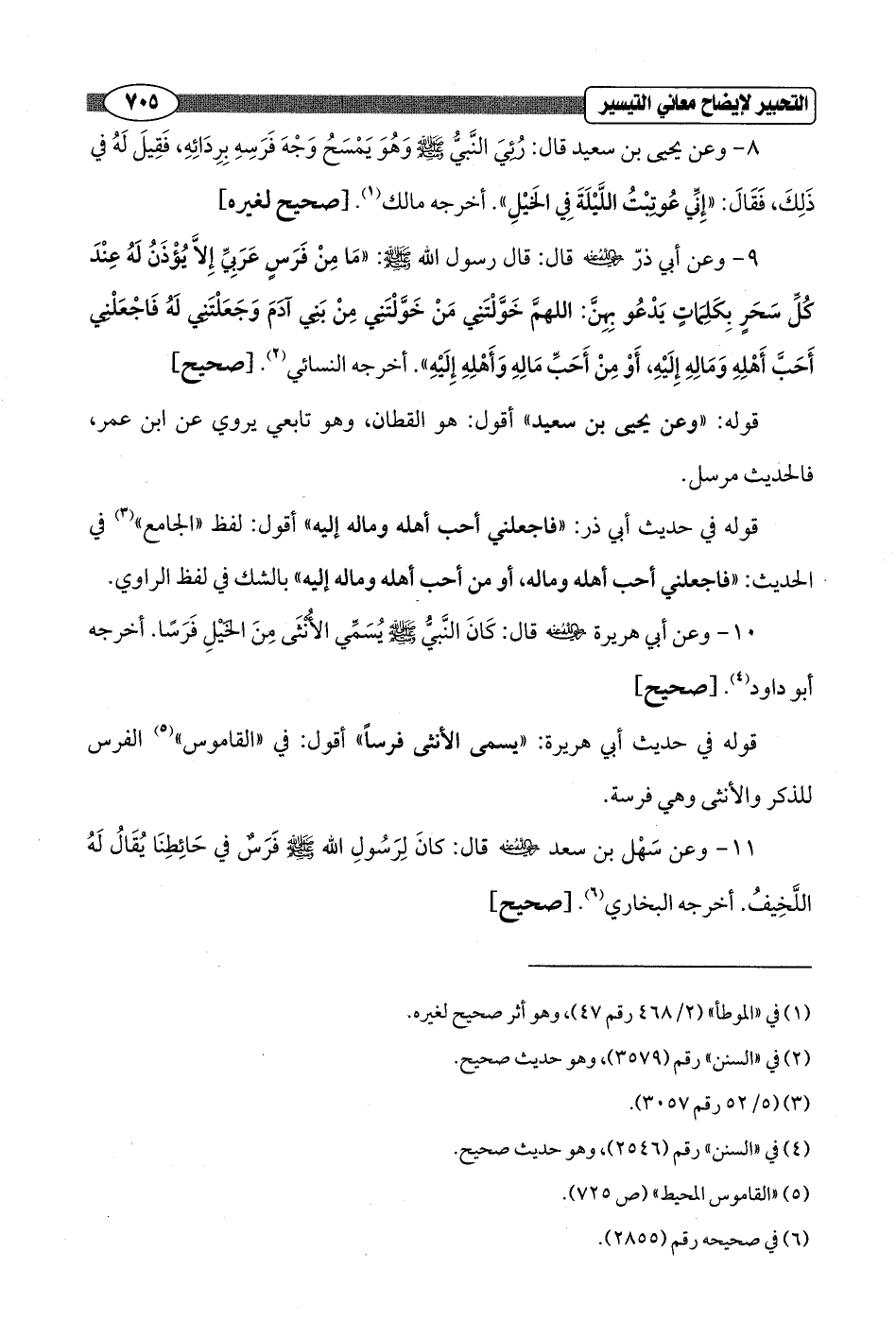 8 - وعن يحيى بن سعيد قال رُئِيَ النَّبيُّ - صلى الله عليه وسلم - وهُوَ يَمْسَحُ وَجْهَ فَرَسِهِ بِرِدَائِهِ، فَقِيلَ لَهُ في ذَلِكَ، فَقَالَ: "إِنِّي عُوتِبْتُ اللَّيْلَةَ فِي الخَيْلِ". أخرجه مالك (¬1). [صحيح لغيره]