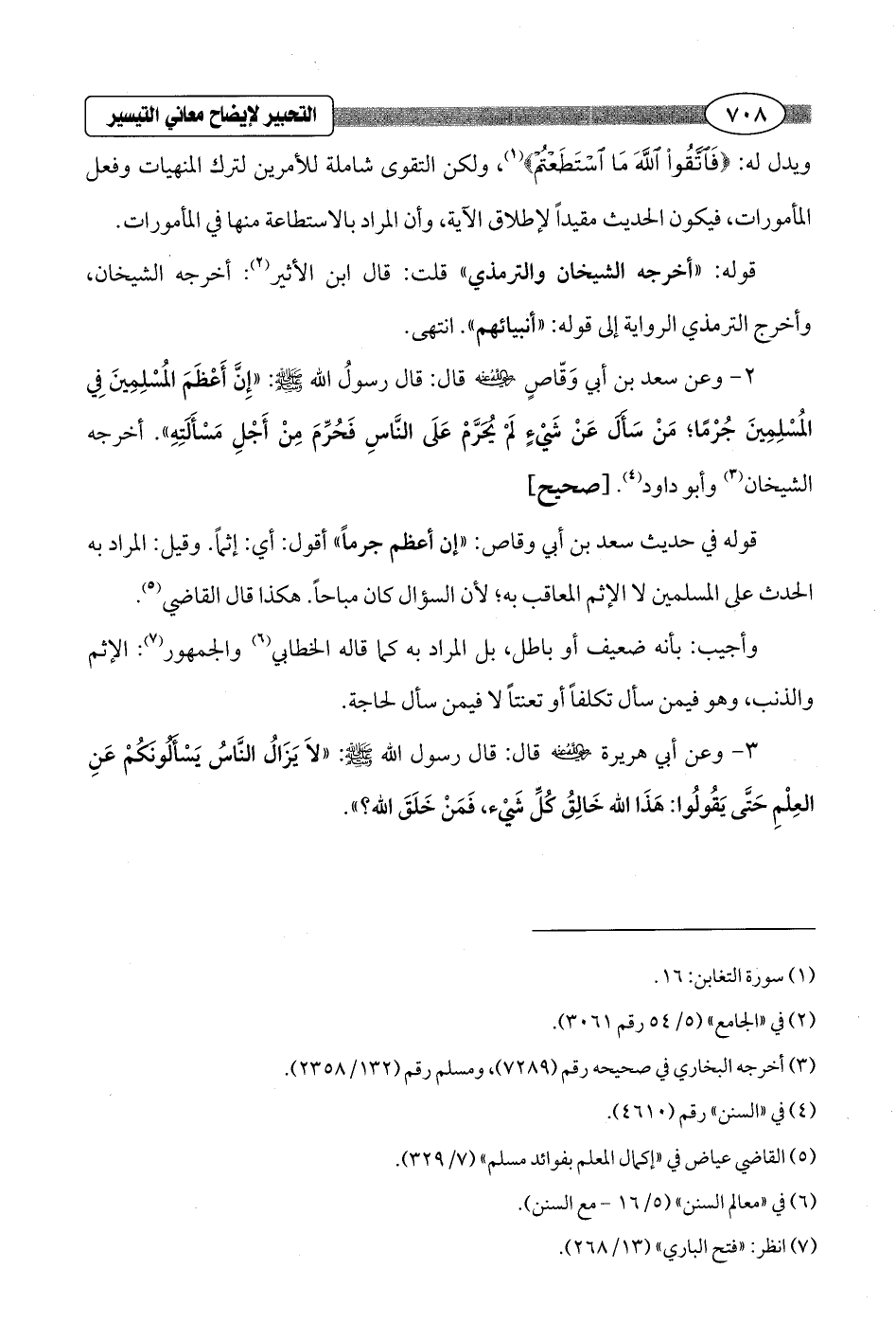 2 - وعن سعد بن أبي وَقّاصٍ - رضي الله عنه - قال: قال رسولُ الله - صلى الله عليه وسلم -: "إِنَّ أَعْظَمَ المُسْلِمِينَ فِي المُسْلِمِينَ جُرْمًا؛ مَنْ سَأَلَ عَنْ شَيْءٍ لَمْ يُحَرَّمْ عَلَى النَّاسِ فَحُرِّمَ مِنْ أَجْلِ مَسْأَلَتِهِ". أخرجه الشيخان (¬3) وأبو داود (¬4). [صحيح]