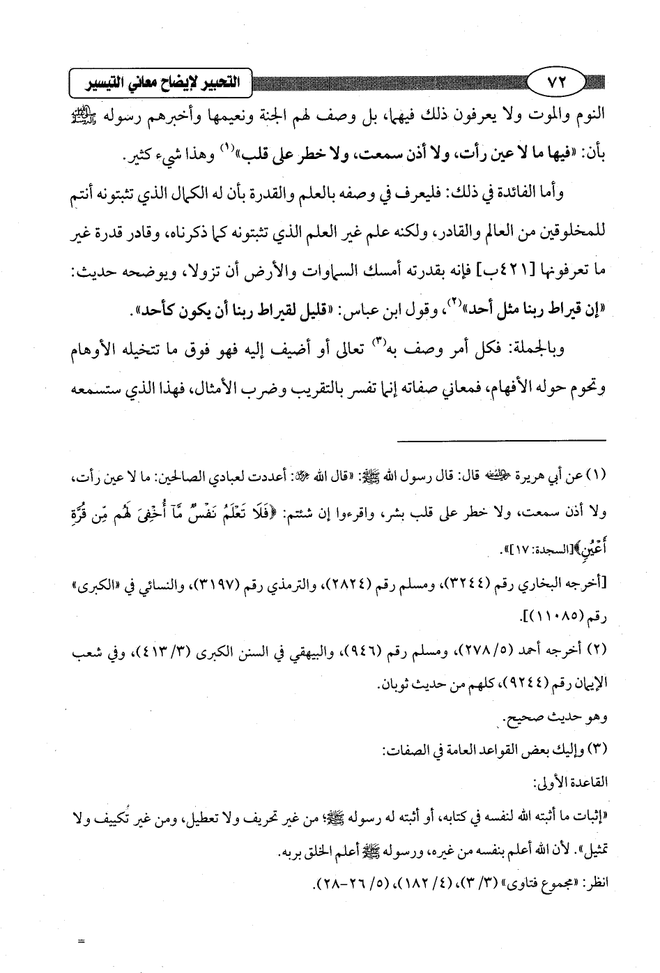 (¬1) عن أبي هريرة - رضي الله عنه - قال: قال رسول الله - صلى الله عليه وسلم -: "قال الله - عز وجل -: أعددت لعبادي الصالحين: ما لا عين رأت, ولا أذن سمعت، ولا خطر على قلب بشر، واقرءوا إن شئتم: {فَلَا تَعْلَمُ نَفْسٌ مَا أُخْفِيَ لَهُمْ مِنْ قُرَّةِ أَعْيُنٍ} [السجدة: 17] ".