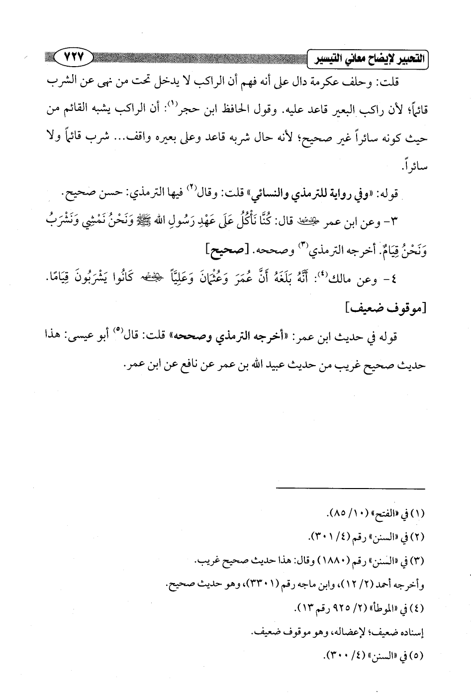 3 - وعن ابن عمر - رضي الله عنهما - قال: كُنَّا نَأْكُلُ عَلَى عَهْدِ رَسُولِ الله - صلى الله عليه وسلم - ونَحْنُ نَمْشِي وَنَشْرَبُ وَنَحْنُ قِيَامٌ. أخرجه الترمذي (¬3) وصححه. [صحيح]