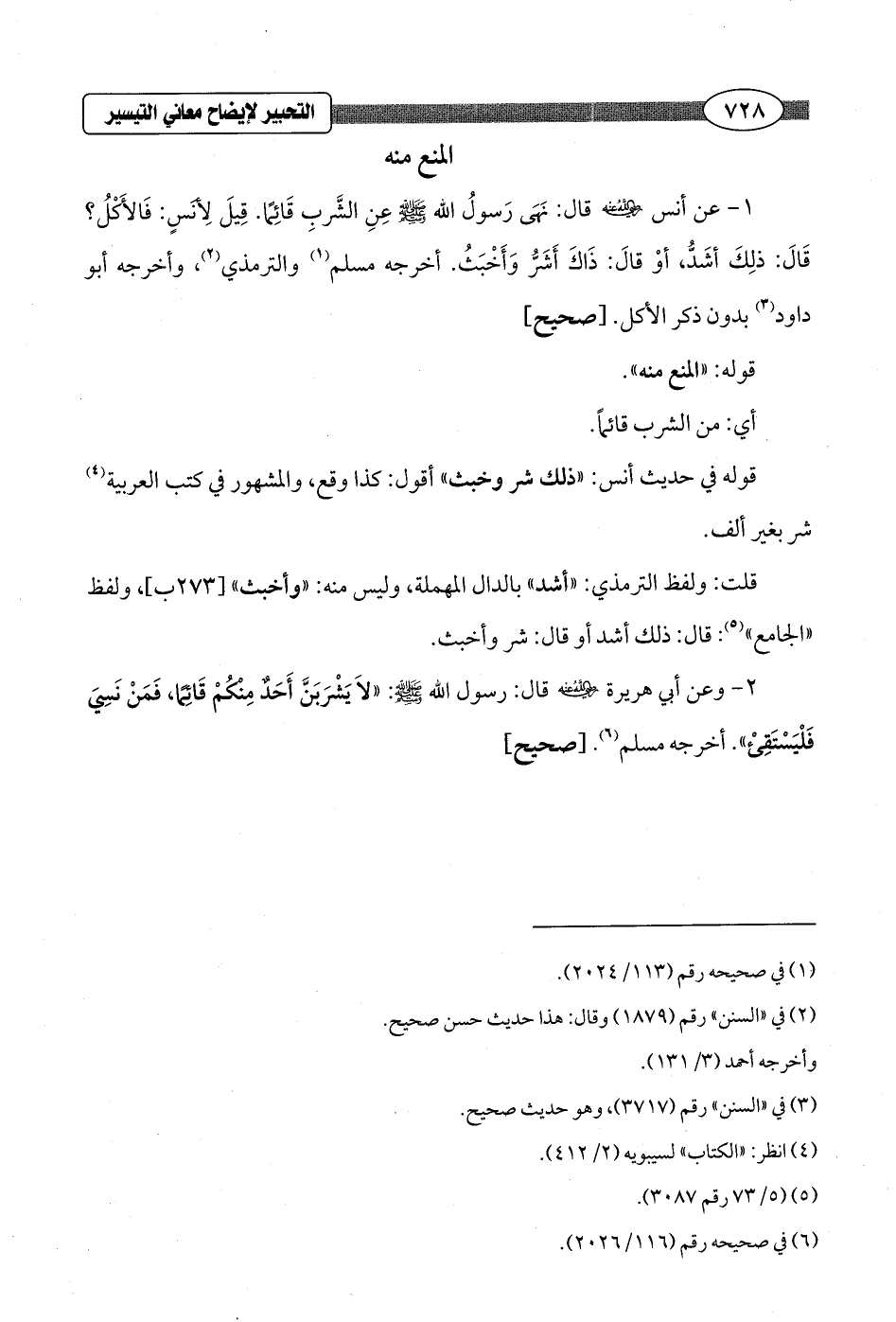 1 - عن أنس - رضي الله عنه - قال: نَهَى رَسولُ الله - صلى الله عليه وسلم - عِنِ الشَّربِ قَائِمًا. قِيلَ لِأَنسٍ: فَالأَكْلُ؟ قَالَ: ذلِكَ أشَدُّ، أوْ قَالَ: ذَاكَ أَشَرُّ وَأَخْبَثُ. أخرجه مسلم (¬1) والترمذي (¬2)، وأخرجه أبو داود (¬3) بدون ذكر الأكل. [صحيح]