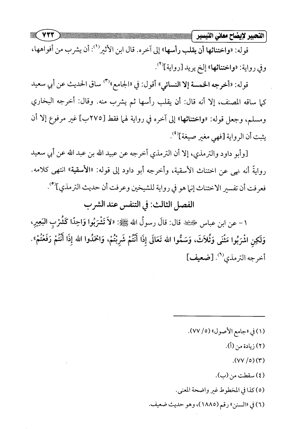 قوله: "أخرجه الخمسة إلا النسائي" أقول: في "الجامع" (¬3) ساق الحديث عن أبي سعيد كما ساقه المصنف، إلا أنه قال: أن يقلب رأسها ثم يشرب منه. وقال: أخرجه البخاري ومسلم، وجعل قوله: "واختناثها" إلى آخره في رواية لهما فقط [275 ب] غير مرفوع إلا أن يثبت أن الرواية [فهي مغير صيغة] (¬4).