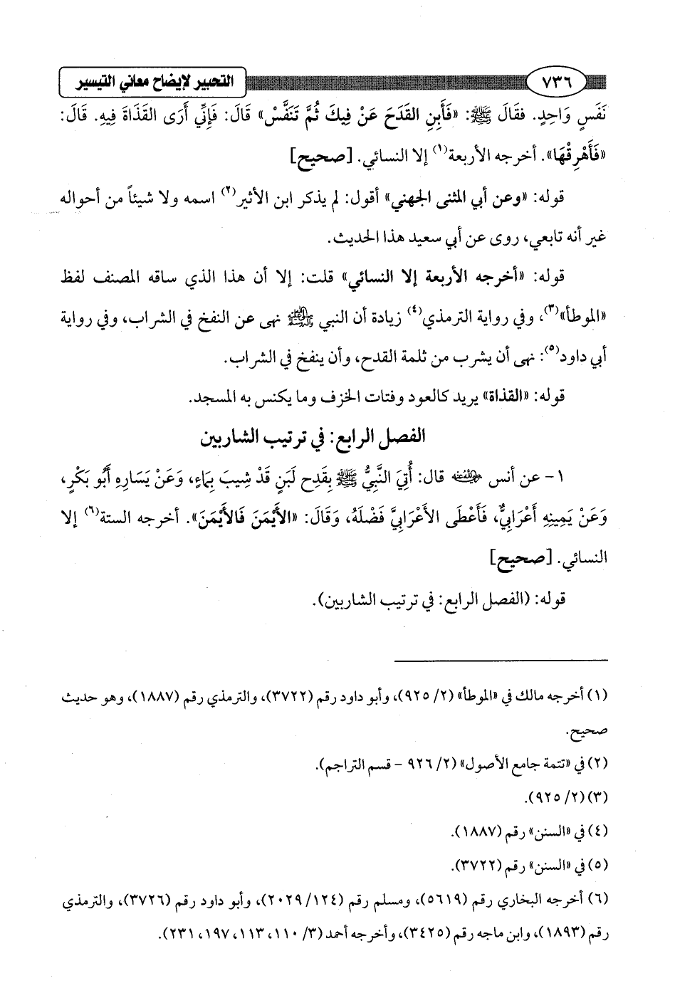نَفَسٍ وَاحِدٍ. فقَالَ - صلى الله عليه وسلم -: "فَأَبِنِ القَدَحَ عَنْ فِيكَ ثُمَّ تَنَفَّسْ" قَالَ: فَإِنِّي أَرَى القَذَاةَ فِيهِ. قَالَ: "فَأَهْرِقْهَا". أخرجه الأربعة (¬1) إلا النسائي. [صحيح]
