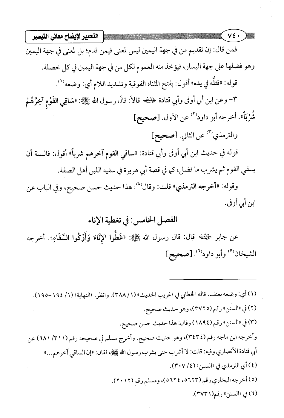 3 - وعن ابن أبي أوفى وأبي قتادة - رضي الله عنهم - قالاَ: قَالَ رسول الله - صلى الله عليه وسلم -: "سَاقِي القَوْمِ آخِرُهُمْ شُرْبَاً". أخرجه أبو داود (¬2) عن الأول. [صحيح]