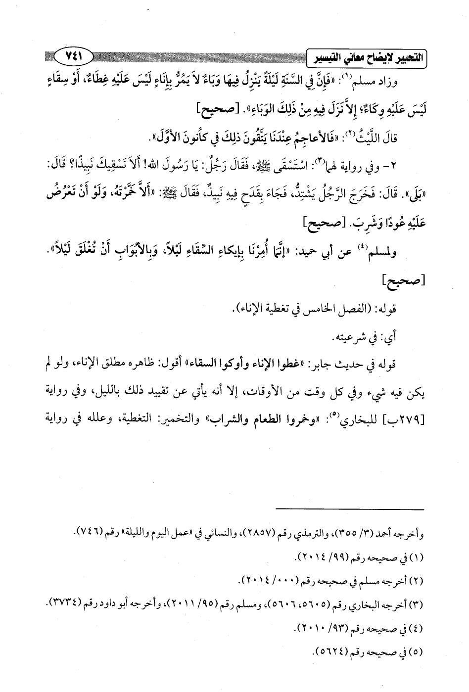 وزاد مسلم (¬1): "فَإِنَّ فِي السَّنَةِ لَيْلَةً يَنْزِلُ فِيهَا وَبَاءٌ لاَ يَمُرُّ بِإِنَاءٍ لَيْسَ عَلَيْهِ غِطَاءٌ، أَوْ سِقَاءٍ لَيْسَ عَلَيْهِ وِكَاءٌ؛ إِلَّا نَزَلَ فِيهِ مِنْ ذَلِكَ الوَبَاءِ". [صحيح]