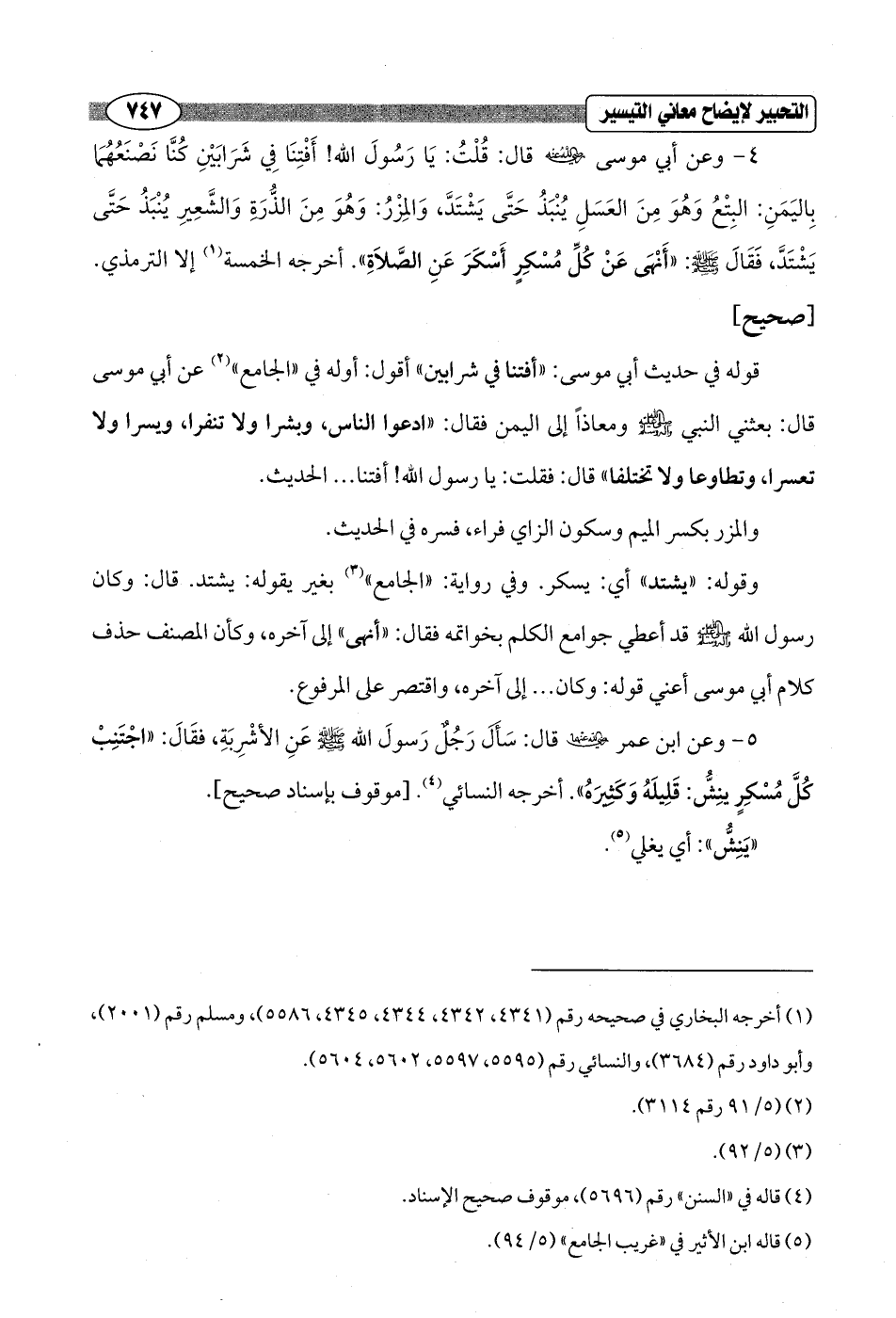 4 - وعن أبي موسى - رضي الله عنه - قال: قُلْتُ: يَا رَسُولَ الله! أَفْتِنَا فِي شَرَابَيْنِ كُنَّا نَصْنَعُهُمَا بِاليَمَنِ: البِتْعُ وَهُوَ مِنَ العَسَلِ يُنْبَذُ حَتَّى يَشْتَدَّ، وَالمِزْرُ: وَهُوَ مِنَ الذُّرَةِ وَالشَّعِيرِ يُنْبَذُ حَتَّى يَشْتَدَّ، فَقَالَ - صلى الله عليه وسلم -: "أَنْهَى عَنْ كُلِّ مُسْكِرٍ أَسْكَرَ عَنِ الصَّلاَةِ". أخرجه الخمسة (¬1) إلا الترمذي. [صحيح]
