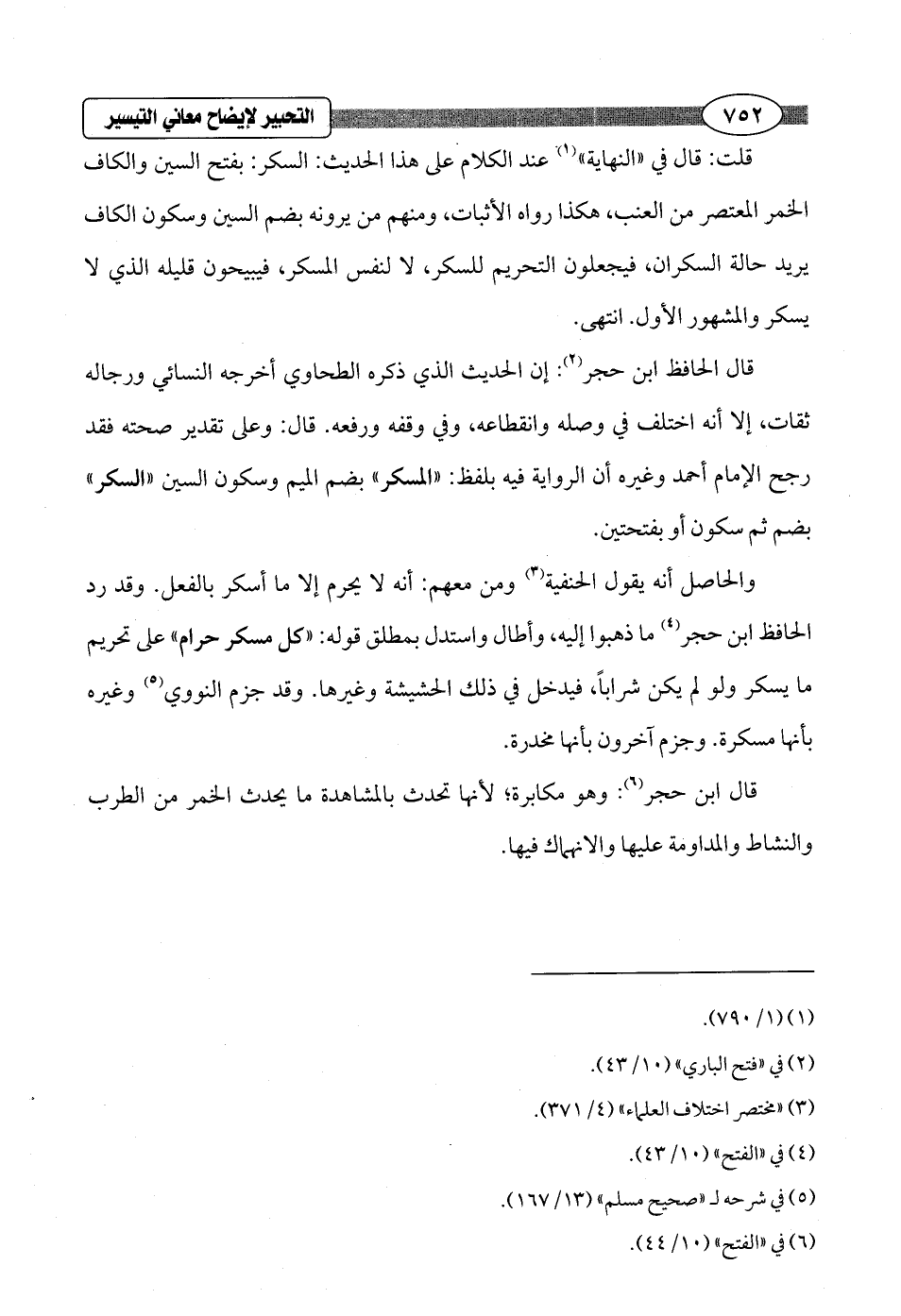 قال الحافظ ابن حجر (¬2): إن الحديث الذي ذكره الطحاوي أخرجه النسائي ورجاله ثقات، إلا أنه اختلف في وصله وانقطاعه، وفِى وقفه ورفعه. قال: وعلى تقدير صحته فقد رجح الإمام أحمد وغيره أن الرواية فيه بلفظ: "المسكر" بضم الميم وسكون السين "السكر" بضم ثم سكون أو بفتحتين.