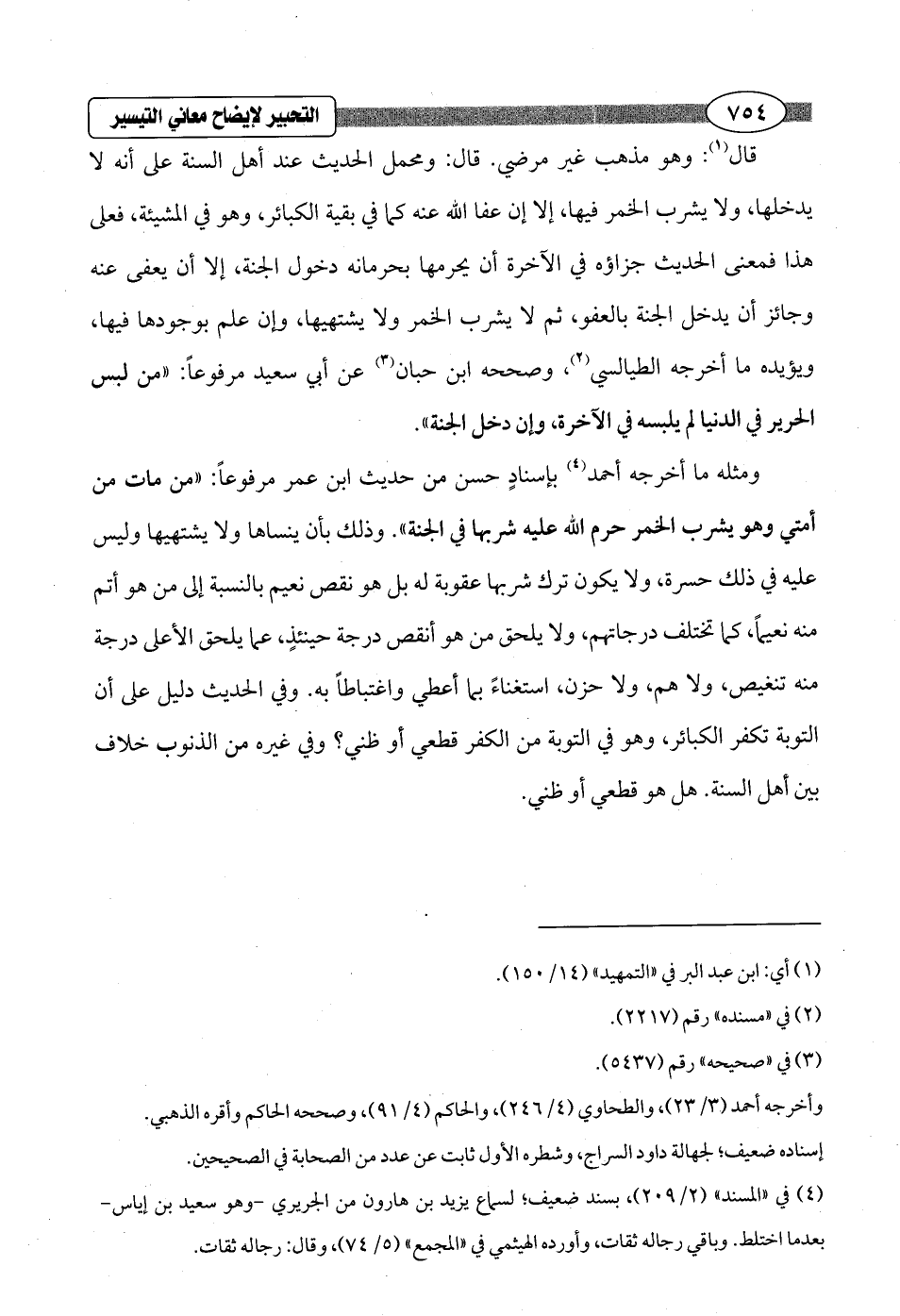 قال (¬1): وهو مذهب غير مرضي. قال: ومحمل الحديث عند أهل السنة على أنه لا يدخلها، ولا يشرب الخمر فيها، إلا إن عفا الله عنه كما في بقية الكبائر، وهو في المشيئة، فعلى هذا فمعنى الحديث جزاؤه في الآخرة أن يحرمها بحرمانه دخول الجنة، إلا أن يعفى عنه وجائز أن يدخل الجنة بالعفو، ثم لا يشرب الخمر ولا يشتهيها، وإن علم بوجودها فيها، ويؤيده ما أخرجه الطيالسي (¬2)، وصححه ابن حبان (¬3) عن أبي سعيد مرفوعاً: "من لبس الحرير في الدنيا لم يلبسه في الآخرة، وإن دخل الجنة".