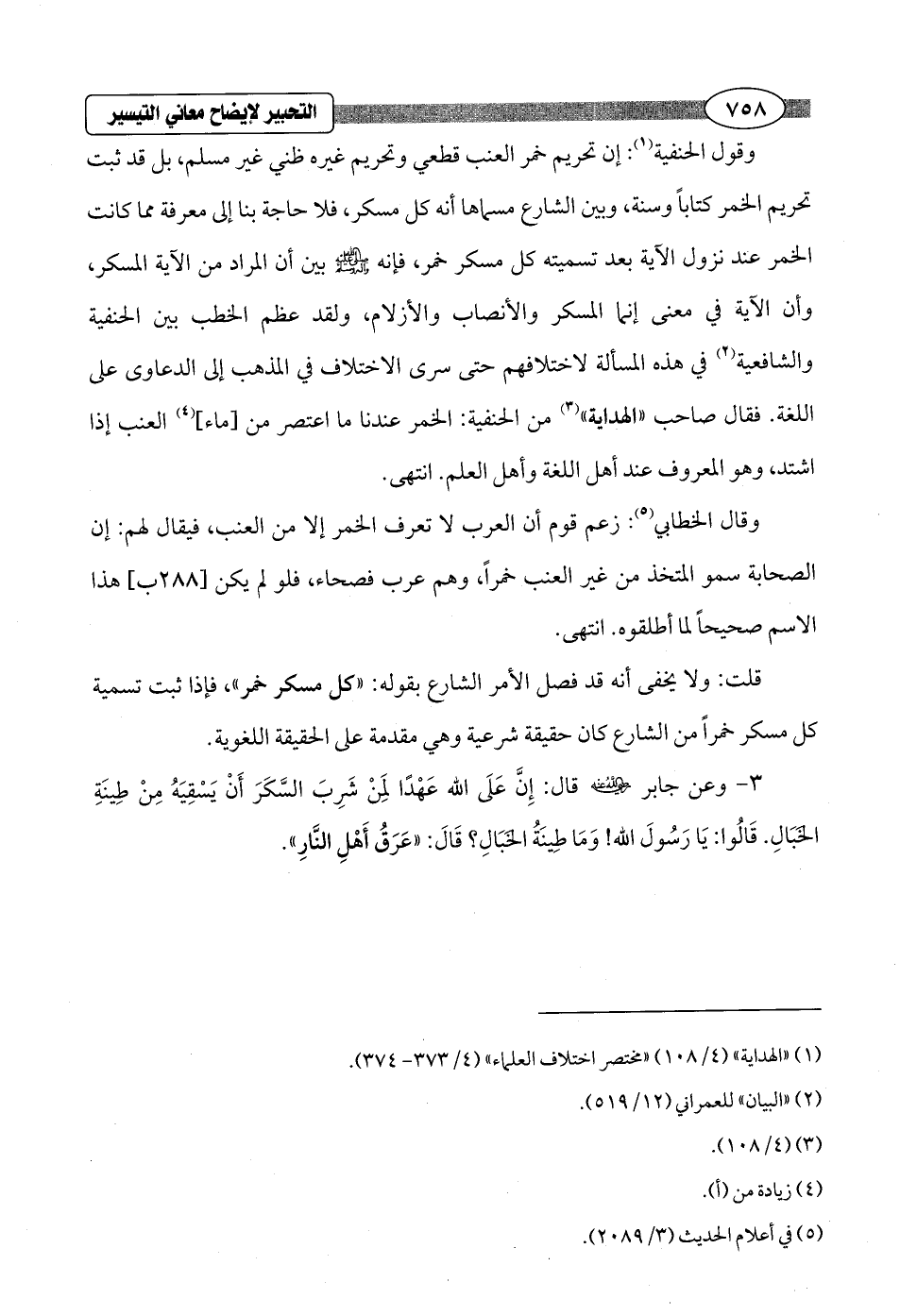 وقول الحنفية (¬1): إن تحريم خمر العنب قطعي وتحريم غيره ظني غير مسلم، بل قد ثبت تحريم الخمر كتاباً وسنة، وبين الشارع مسماها أنه كل مسكر، فلا حاجة بنا إلى معرفة مما كانت الخمر عند نزول الآية بعد تسميته كل مسكر خمر، فإنه - صلى الله عليه وسلم - بين أن المراد من الآية المسكر، وأن الآية في معنى إنما المسكر والأنصاب والأزلام، ولقد عظم الخطب بين الحنفية والشافعية (¬2) في هذه المسألة لاختلافهم حتى سرى الاختلاف في المذهب إلى الدعاوى على اللغة. فقال صاحب "الهداية" (¬3) من الحنفية: الخمر عندنا ما اعتصر من [ماء] (¬4) العنب إذا اشتد، وهو المعروف عند أهل اللغة وأهل العلم. انتهى.