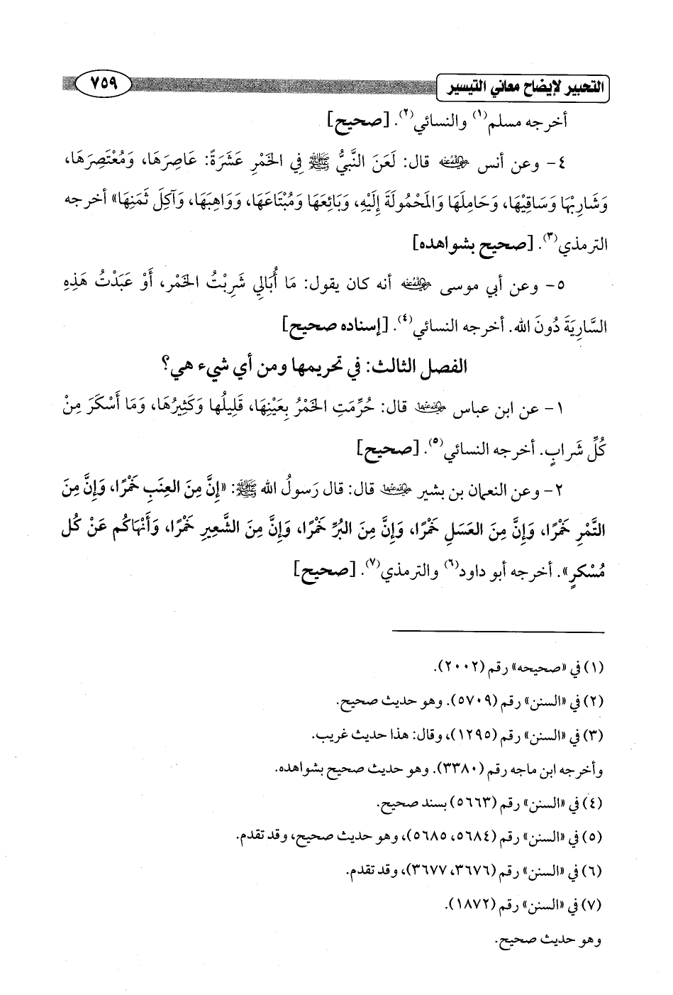 1 - عن ابن عباس - رضي الله عنهما - قال: حُرِّمَتِ الخَمْرُ بِعَيْنِهَا، قَلِيلُها وَكَثِيرُهَا، وَمَا أَسْكَرَ مِنْ كُلِّ شَرابٍ. أخرجه النسائي (¬5). [صحيح]