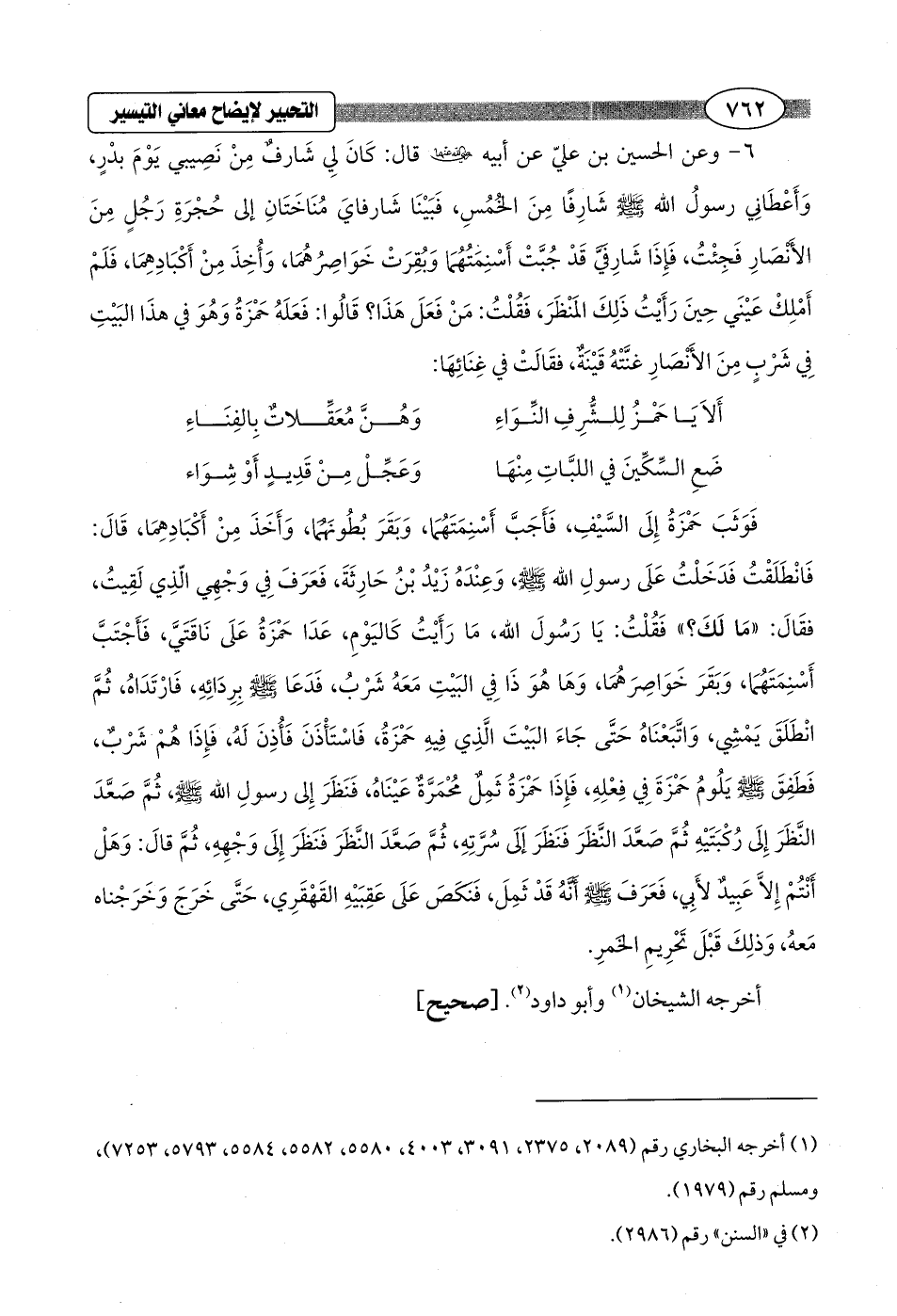 6 - وعن الحسن بن عليّ عن أبيه - رضي الله عنهما - قال: كَانَ ليِ شَارفٌ مِنْ نَصِيبي يَوْمَ بدْرٍ، وَأَعْطَانِي رسولُ الله - صلى الله عليه وسلم - شَارِفًا مِنَ الخُمُسِ، فَبَيْنَا شَارفايَ مُنَاخَتَانِ إلى حُجْرَةِ رَجُلٍ مِنَ الأَنْصَارِ فَجِئْتُ، فَإِذَا شَارِفَيَّ قَدْ جُبَّتْ أَسْنِمَتُهُمَا وَبُقِرَتْ خَوَاصِرُهُمَا، وَأُخِذَ مِنْ أَكْبَادِهِمَا، فَلَمْ أَمْلِكْ عَيْنَي حِينَ رَأَيْتُ ذَلِكَ المَنْظَرَ، فَقُلْتُ: مَنْ فَعَلَ هَذَا؟ قَالُوا: فَعَلَهُ حَمْزَةُ وَهُوَ في هذَا البَيْتِ فِي شَرْبٍ مِنَ الأَنْصَارِ غنَّتْهُ قَيْنَةٌ، فقَالَتْ في غِنَائِهَا: