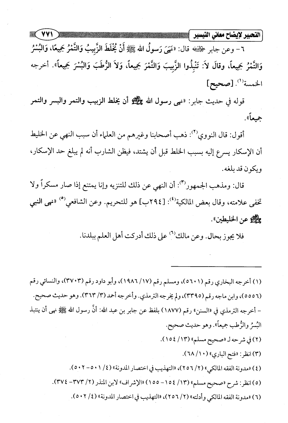 6 - وعن جابر - رضي الله عنه - قال: "نَهَىَ رَسولُ الله - صلى الله عليه وسلم - أَنْ يُخْلَطَ الزَّبِيبُ وَالتَّمْرُ جَمِيعًا، وَالبُسْرُ وَالتَّمْرُ جَمِيعاً، وقالَ لاَ: تَنْبِذُوا الزَّبِيبَ وَالتَّمْرَ جَمِيعاً، وَلاَ الرُّطَبَ وَالبُسْرَ جَمِيعاً". أخرجه الخمسة (¬1). [صحيح]