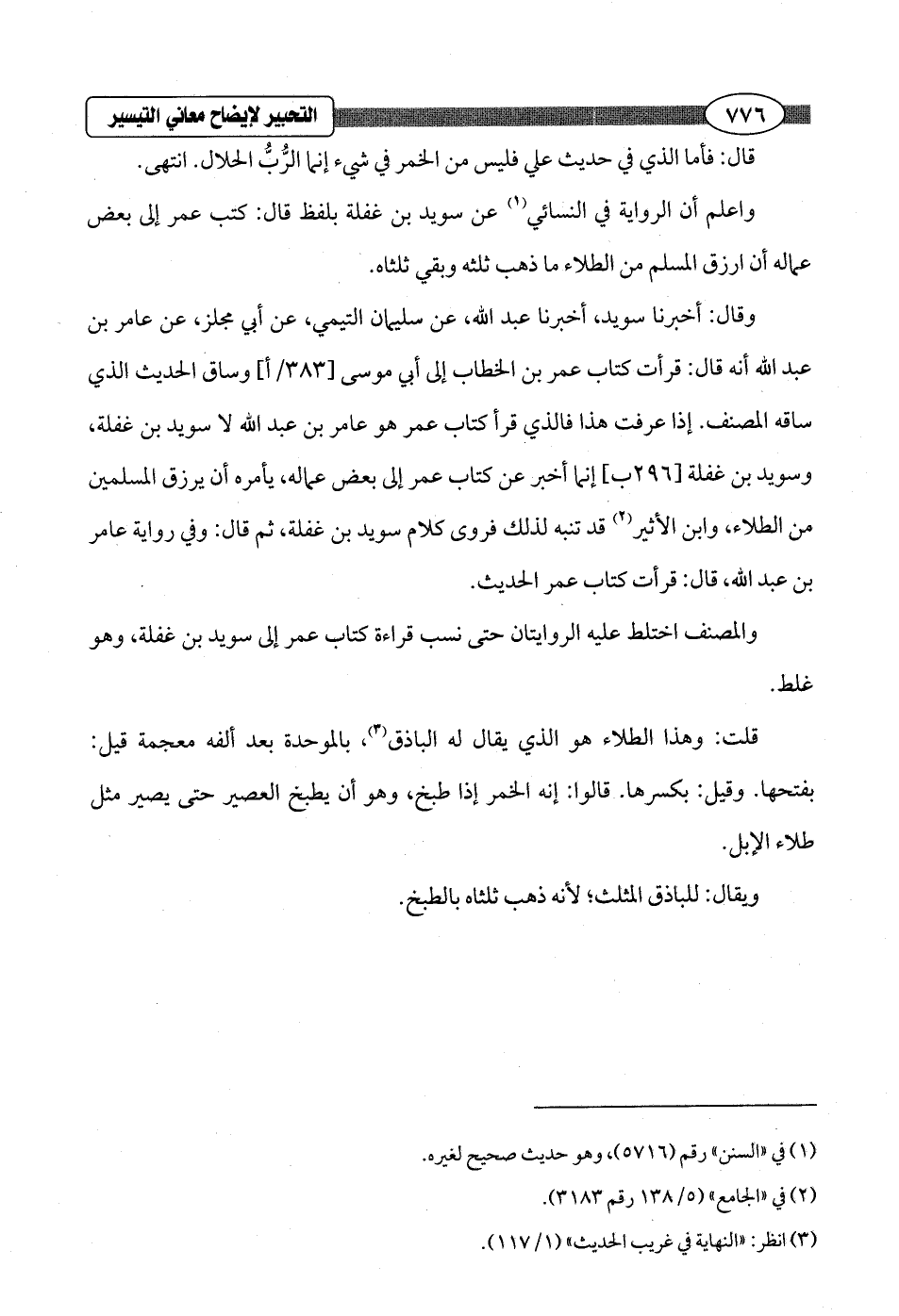 قال: فأما الذي في حديث علي فليس من الخمر في شيء إنما الرُّبُّ الحلال. انتهى. واعلم أن الرواية في النسائي (¬1) عن سويد بن غفلة بلفظ قال: كتب عمر إلى بعض عماله أن ارزق المسلم من الطلاء ما ذهب ثلثه وبقي ثلثاه.