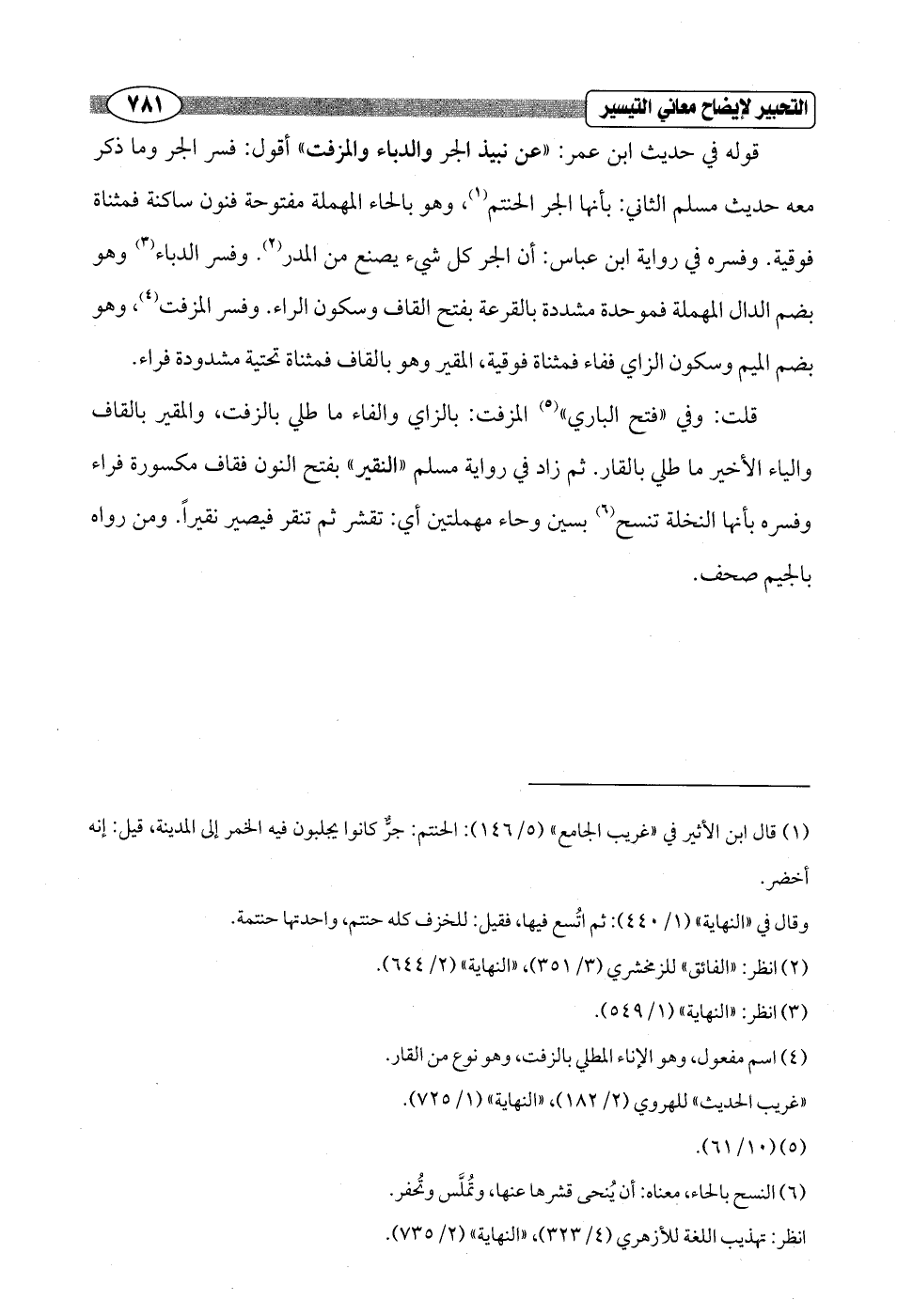 قلت: وفي "فتح الباري" (¬5) المزفت: بالزاي والفاء ما طلي بالزفت، والمقير بالقاف والياء الأخير ما طلي بالقار. ثم زاد في رواية مسلم "النقير" بفتح النون فقاف مكسورة فراء وفسره بأنها النخلة تنسح (¬6) بسين وحاء مهملتين أي: تقشر ثم تنقر فيصير نقيراً. ومن رواه بالجيم صحف.