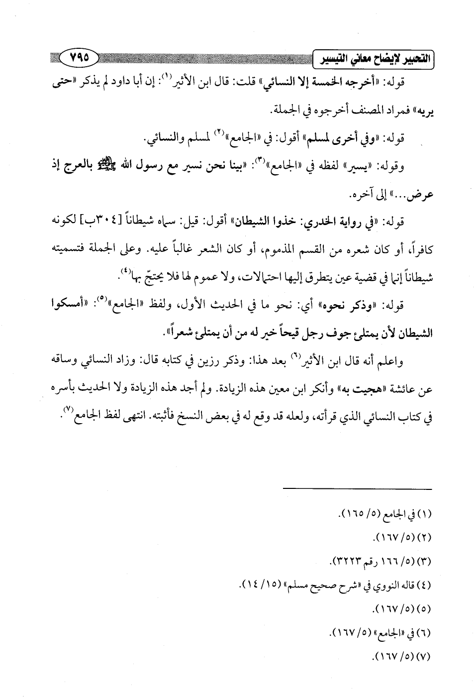 قوله: "في رواية الخدري: خذوا الشيطان" أقول: قيل: سماه شيطاناً [304 ب] لكونه كافراً، أو كان شعره من القسم المذموم، أو كان الشعر غالباً عليه. وعلى الجملة فتسميته شيطاناً إنما في قضية عين يتطرق إليها احتمالات، ولا عموم لها فلا يحتجّ بها (¬4).
