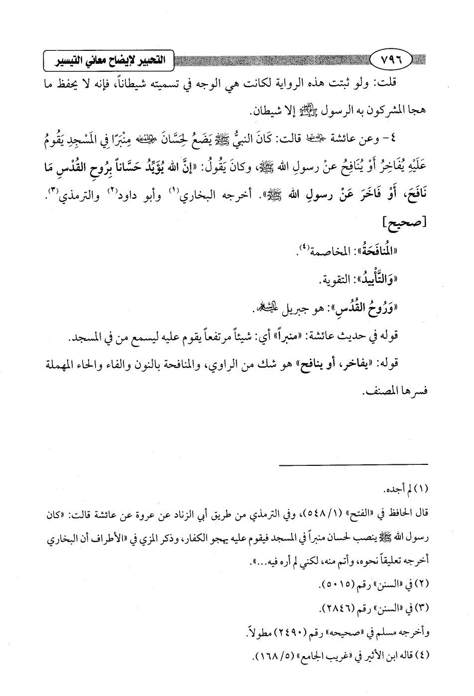 قال الحافظ في "الفتح" (1/ 548)، وفي الترمذي من طريق أبي الزناد عن عروة عن عائشة قالت: "كان رسول الله - صلى الله عليه وسلم - ينصب لحسان منبراً في المسجد فيقوم عليه يهجو الكفار، وذكر المزي في "الأطراف أن البخاري أخرجه تعليقاً نحوه، وأتم منه، لكني لم أره فيه ... ".