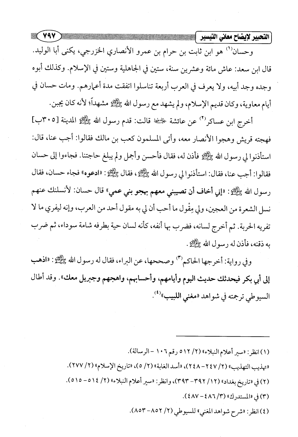 وفي رواية: أخرجها الحاكم (¬3) وصححها، عن البراء، فقال له رسول الله - صلى الله عليه وسلم -: "اذهب إلى أبي بكر فيحدثك حديث اليوم وأيامهم، وأحسابهم، واهجهم وجبريل معك". وقد أطال السيوطي ترجمته في شواهد "مغني اللبيب" (¬4).