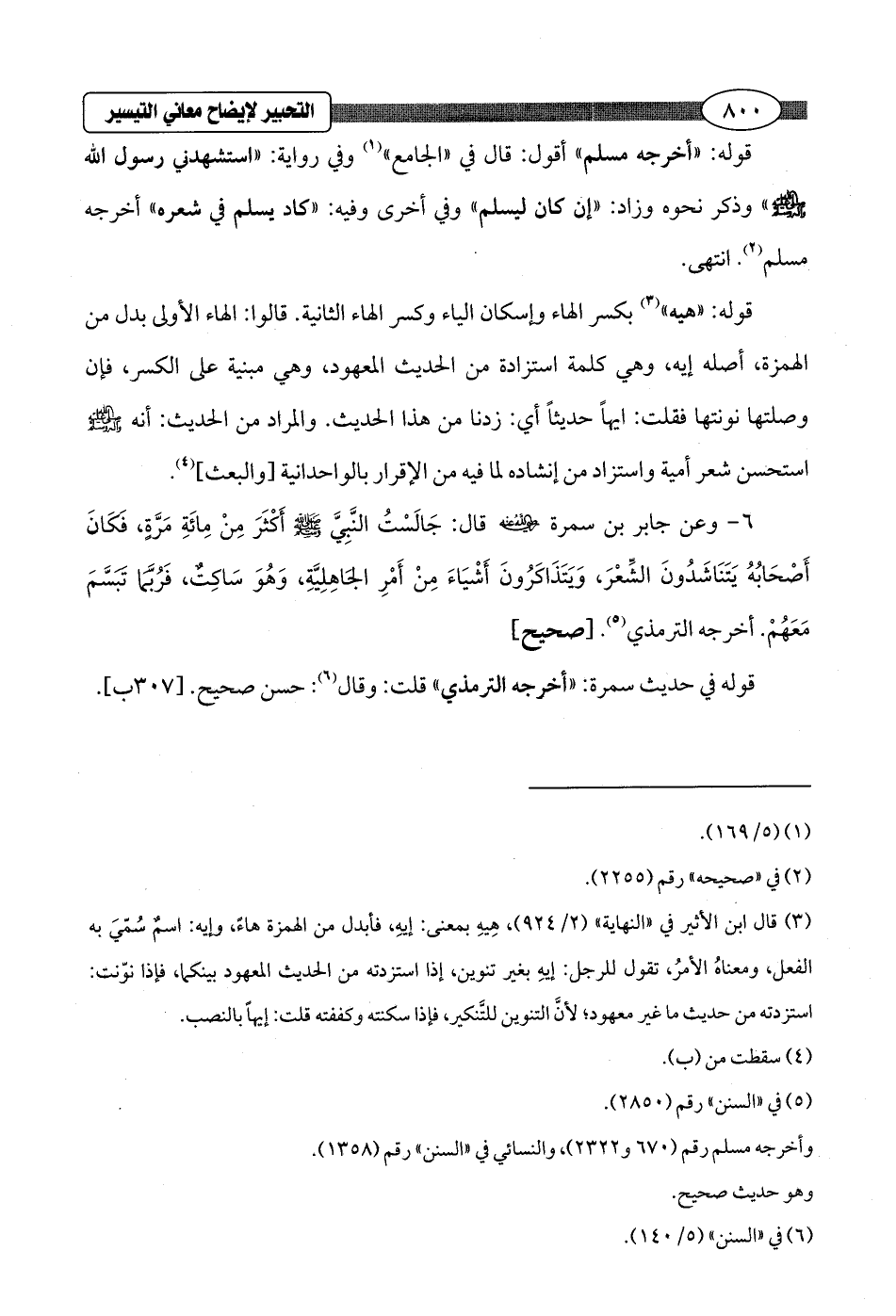 (¬3) قال ابن الأثير في "النهاية" (2/ 924)، هِيهِ بمعنى: إيهِ، فأبدل من الهمزة هاءً، وإيه: اسمٌ سُمّيَ به الفعل، ومعناهُ الأمرُ، تقول للرجل: إيهِ بغير تنوين، إذا استزدته من الحديث المعهود بينكما، فإذا نوّنت: استزدته من حديث ما غير معهود؛ لأنَّ التنوين للتَّنكير، فإذا سكنته وكففته قلت: إيهاً بالنصب.