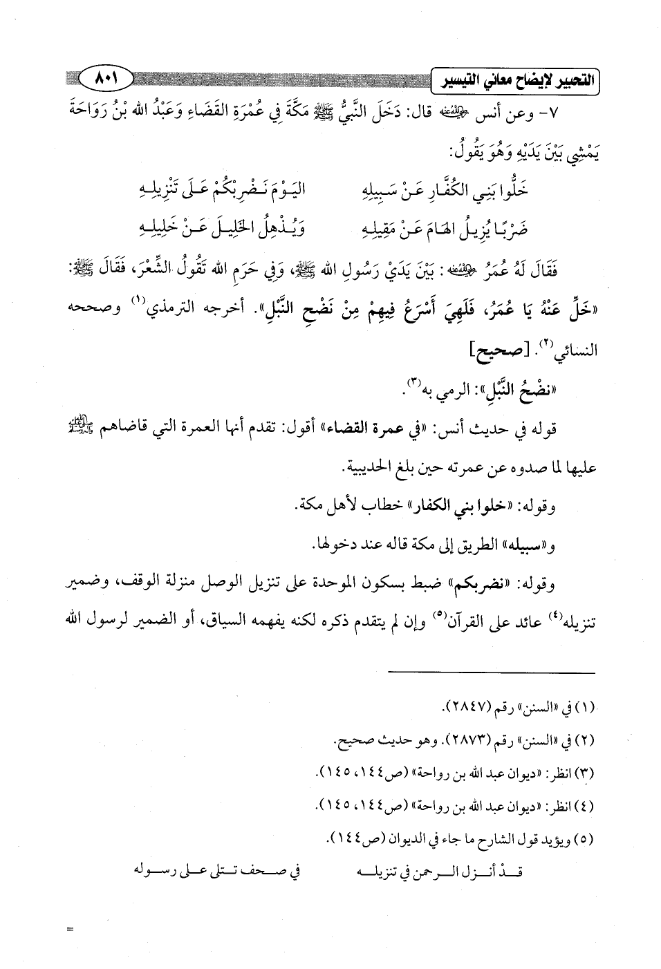 7 - وعن أنس - رضي الله عنه - قال: دَخَلَ النَّبيُّ - صلى الله عليه وسلم - مَكَّةَ فِي عُمْرَةِ القَضَاءِ وَعَبْدُ الله بْنُ رَوَاحَةَ يَمْشِي بَيْنَ يَدَيْهِ وَهُوَ يَقُول:
