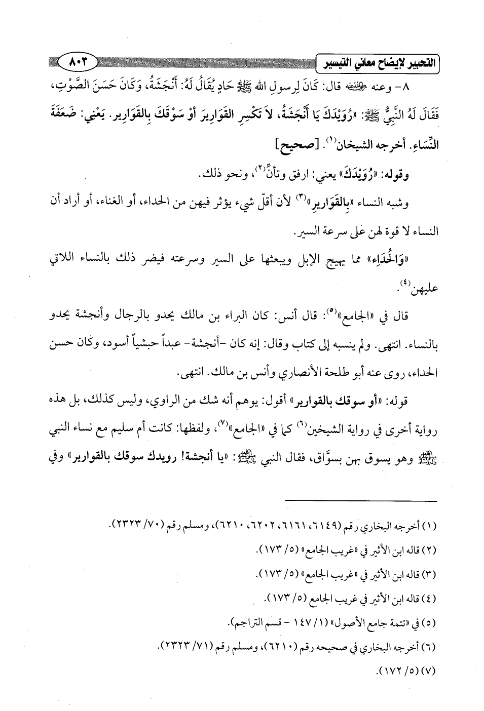 8 - وعنه - رضي الله عنه - قال: كَان لِرسولِ الله - صلى الله عليه وسلم - حَادٍ يُقَالُ لَهُ: أَنْجَشَةُ، وَكَانَ حَسَنَ الصَّوْتِ، فَقَالَ لَهُ النَّبِيُّ - صلى الله عليه وسلم -: "رُوَيْدَكَ يَا أَنْجَشَةُ، لاَ تَكْسِرِ القَوَارِيرَ أوْ سَوْقَكَ بِالقَوَارِير. يَعْنِي: ضَعَفَةَ النِّسَاءِ. أخرجه الشيخان (¬1). [صحيح]