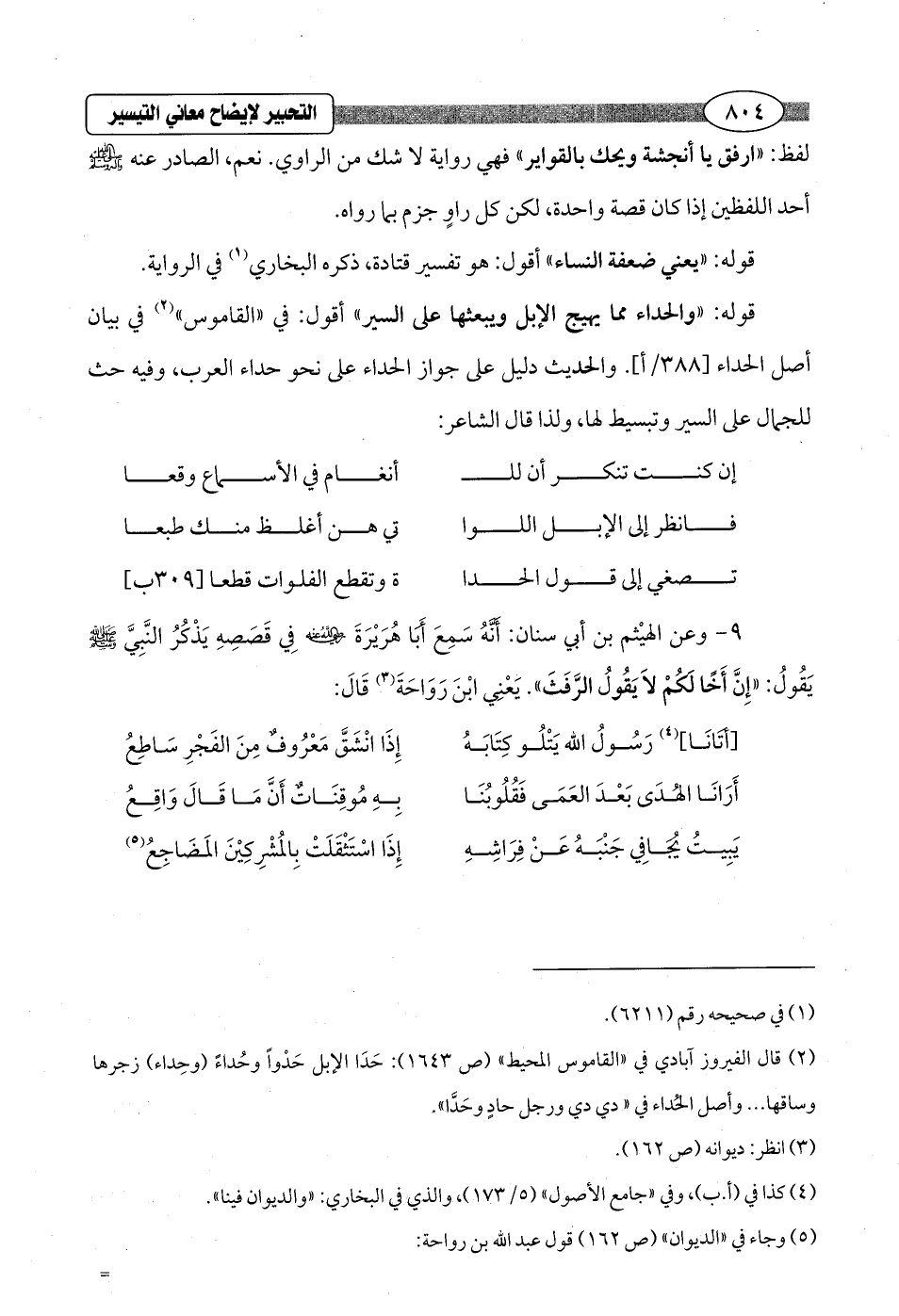 قوله: "والحداء مما يهيج الإبل ويبعثها على السير" أقول: في "القاموس" (¬2) في بيان أصل الحداء [388/ أ]. والحديث دليل على جواز الحداء على نحو حداء العرب، وفيه حث للجمال على السير وتبسيط لها، ولذا قال الشاعر:
