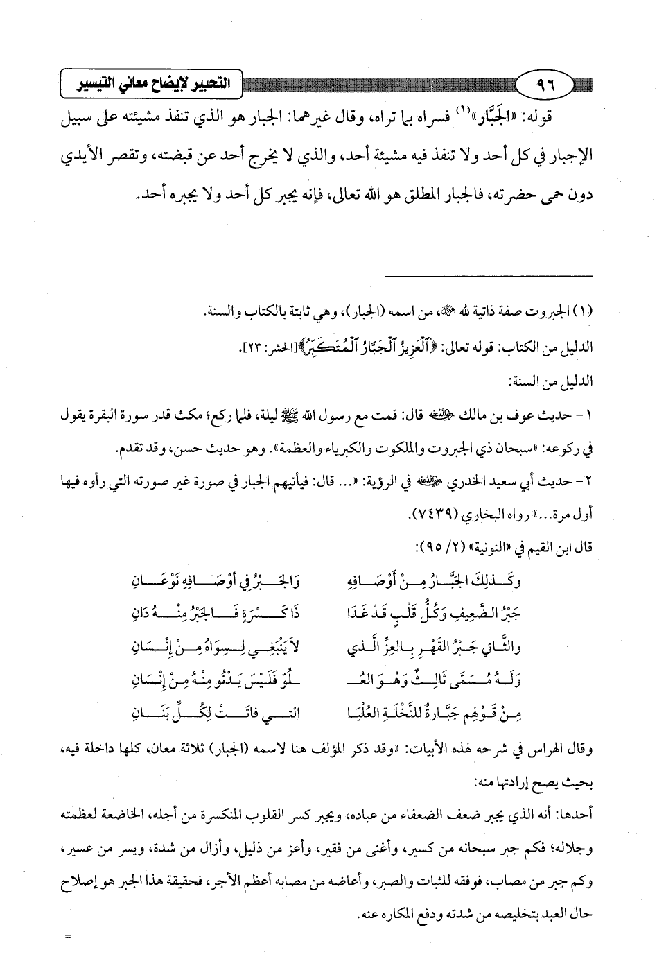 وقال الهراس في شرحه لهذه الأبيات: "وقد ذكر المؤلف هنا لاسمه (الجبار) ثلاثة معان، كلها داخلة فيه، بحيث يصح إرادتها منه: