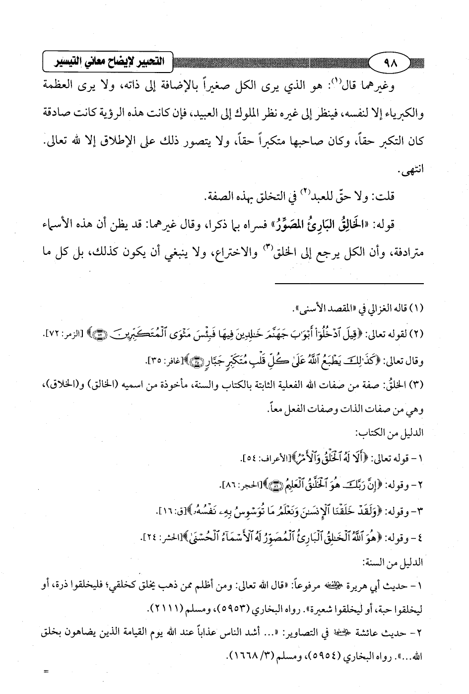 (¬2) لقوله تعالى: {قِيلَ ادْخُلُوا أَبْوَابَ جَهَنَّمَ خَالِدِينَ فِيهَا فَبِئْسَ مَثْوَى الْمُتَكَبِّرِينَ (72)} [الزمر: 72]. وقال تعالى: {كَذَلِكَ يَطْبَعُ اللَّهُ عَلَى كُلِّ قَلْبِ مُتَكَبِّرٍ جَبَّارٍ (35)} [غافر: 35].