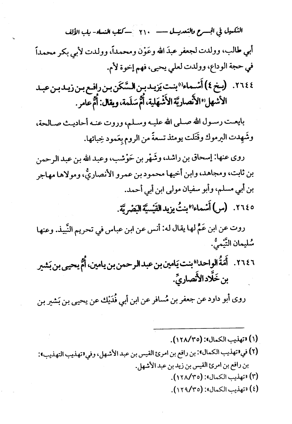 2644 - (بخ 4) أَسْماء (¬1) بنت يَزيد بن السَّكَن بن رافع بن زيد بن عبد الأشهل (¬2) الأَنْصاريَّة الأَشْهَلية، أُمُّ سَلَمة، ويقال: أُمُّ عامر.