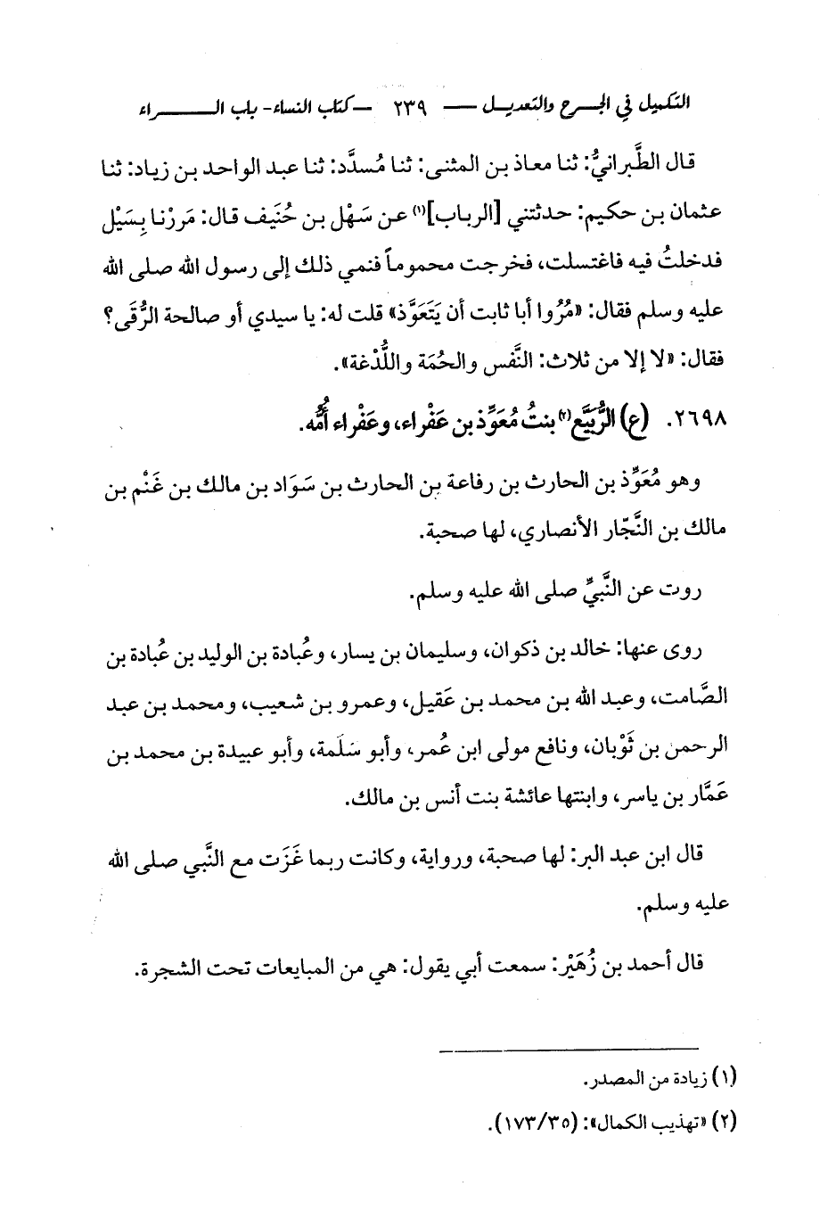 2698 - (ع) الرُّبَيَّع (¬2) بنتُ مُعَوِّذ بن عَفْراء، وعَفْراء أُمُّه.