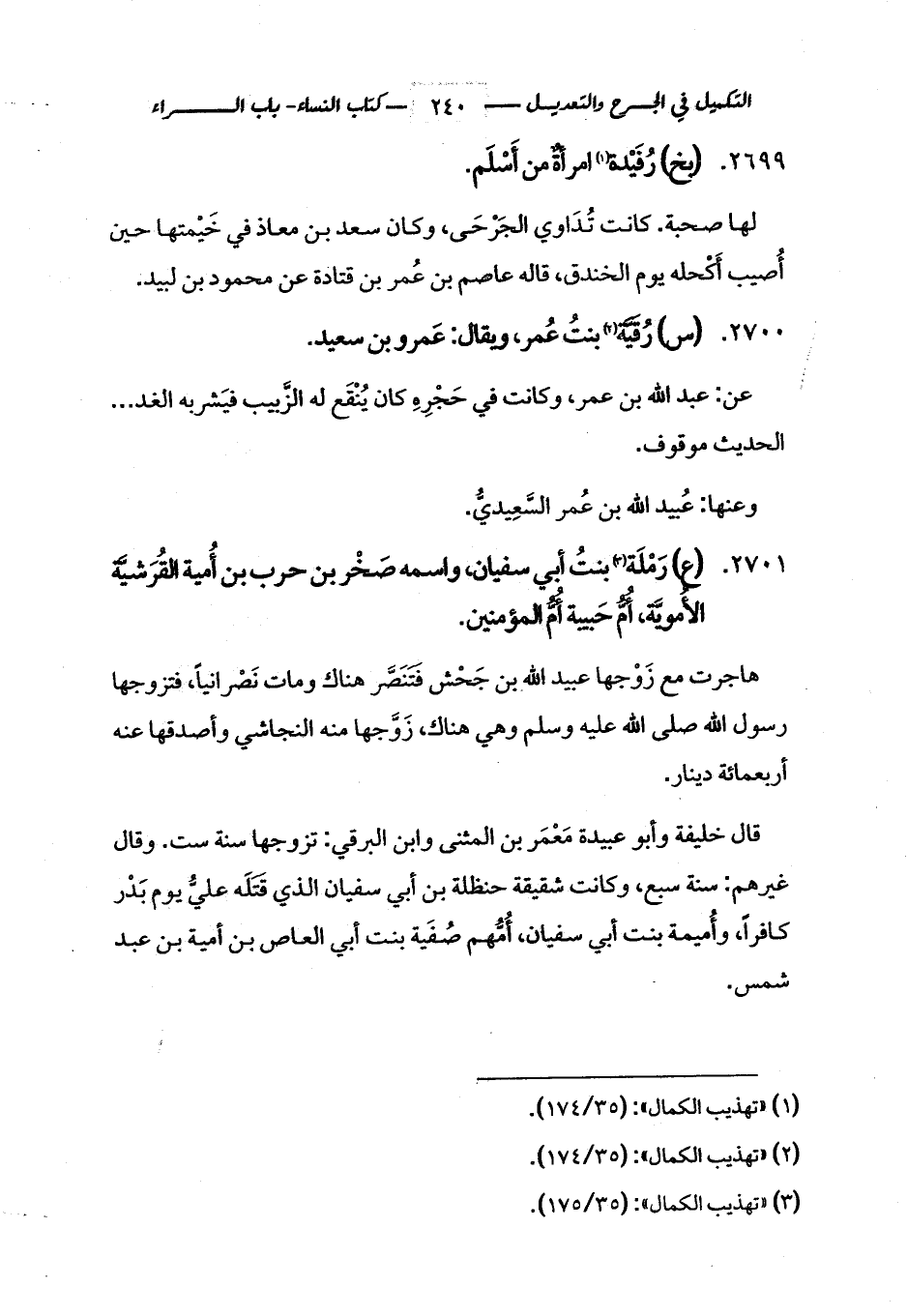 2701 - (ع) رَمْلَة (¬3) بنتُ أبي سفيان، واسمه صَخْر بن حرب بن أُمية القُرَشيَّة الأُمويَّة، أُمُّ حَبيبة أُمُّ المؤمنين.