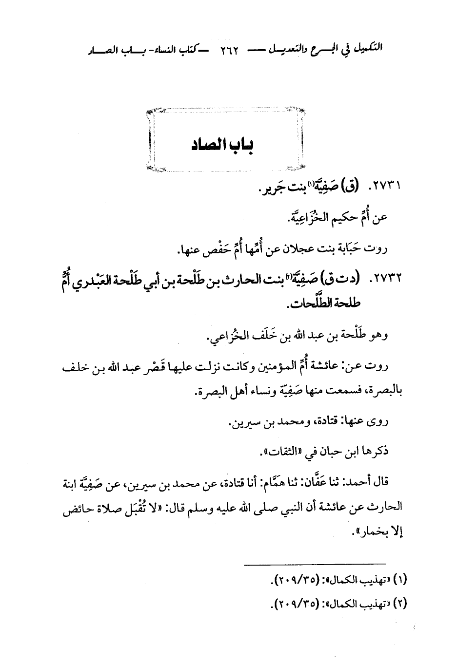2732 - (د ت ق) صَفِيَّة (¬2) بنت الحارث بن طَلْحة بن أبي طَلْحة العَبْدري أُمُّ طلحة الطَّلْحات.