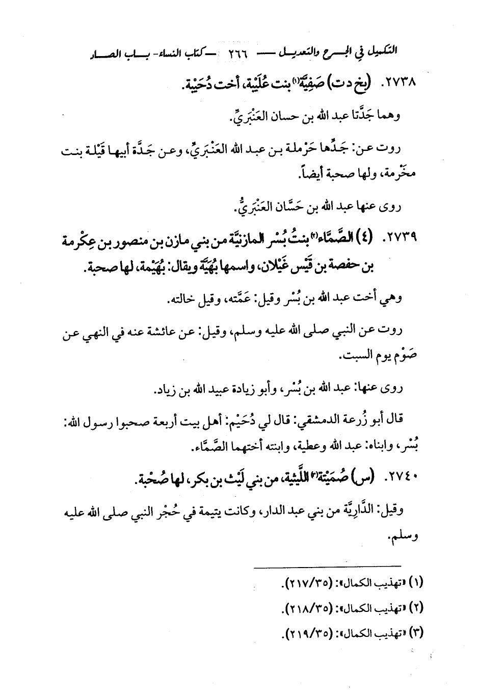 2739 - (4) الصَّمَّاء (¬2) بنتُ بُسْر المازنيَّة من بني مازن بن منصور بن عِكْرمة بن حفصة بن قَيْس غَيْلان، واسمها بُهَيَّة ويقال: بُهَيْمة، لها صحبة.