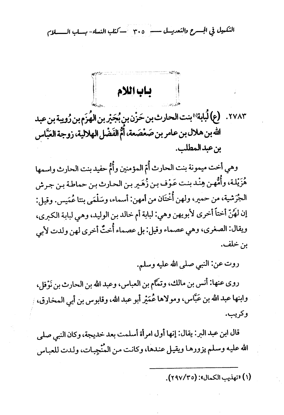 2783 - (ع) لُبابة (¬1) بنت الحارث بن حَزْن بن بُجَيْر بن الهُزَم بن رُويبة بن عبد الله بن هلال بن عامر بن صَعْصَعة، أُمُّ الفَضْل الهلالية، زوجة العَبَّاس بن عبد المطلب.