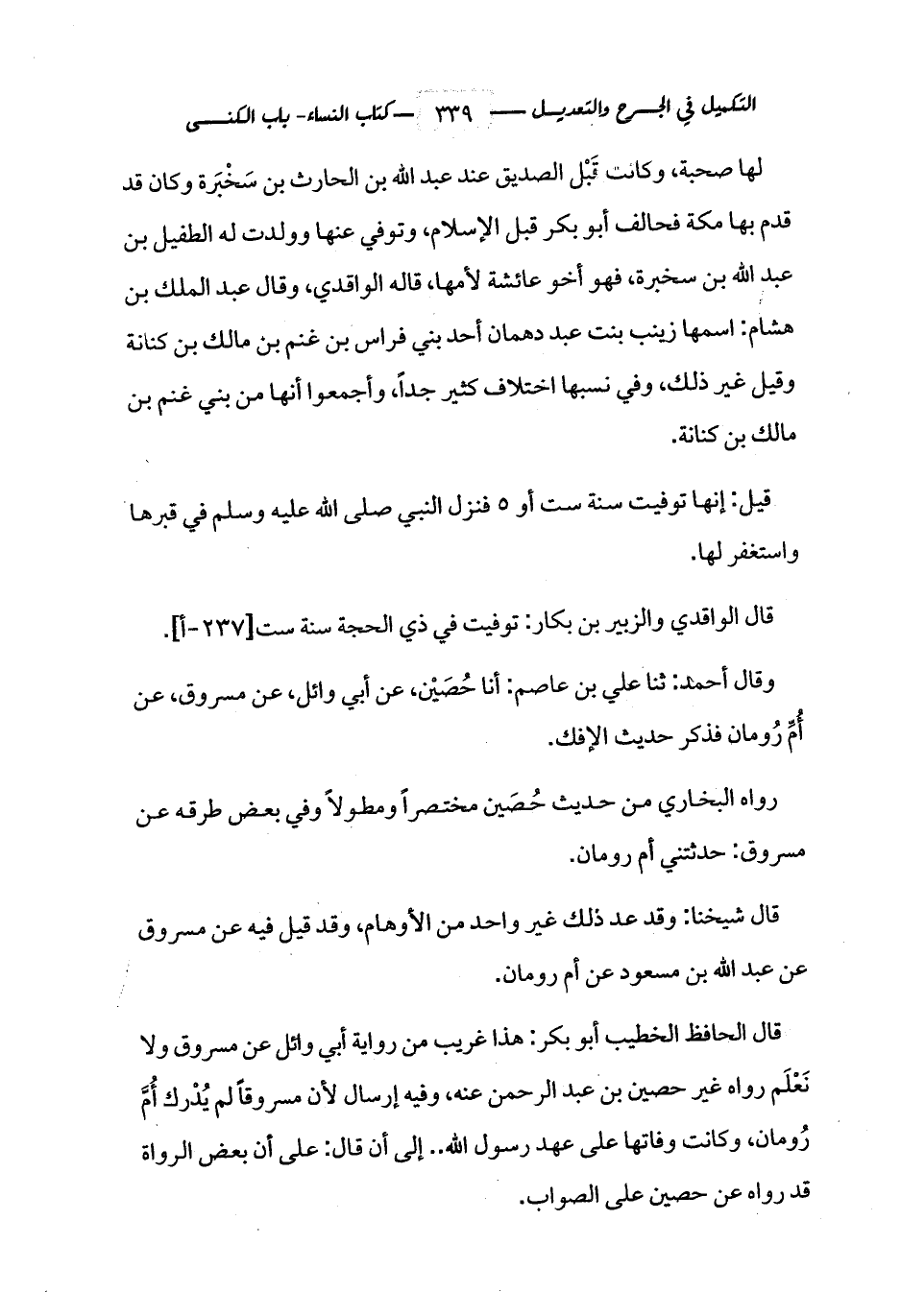 قال الحافظ الخطيب أبو بكر: هذا غريب من رواية أبي وائل عن مسروق ولا نَعْلَم رواه غير حصين بن عبد الرحمن عنه، وفيه إرسال لأن مسروقاً لم يُدْرك أُمَّ رُومان، وكانت وفاتها على عهد رسول الله .. إلى أن قال: على أن بعض الرواة قد رواه عن حصين على الصواب.
