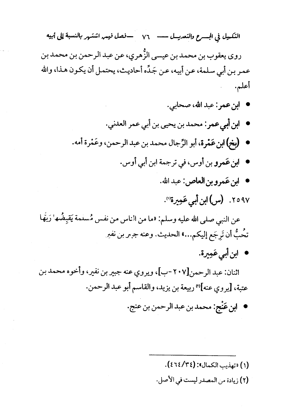 - (بخ) ابن عَمْرة، أبو الرِّجال محمد بن عبد الرحمن، وعَمْرة أمه.
