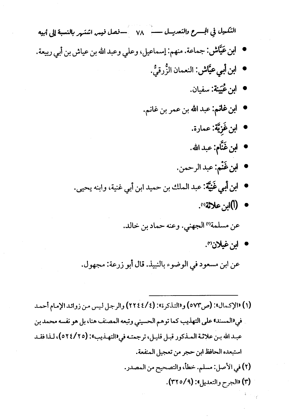 (¬1) «الإكمال»: (ص573) و «التذكرة»: (4/ 2244) والرجل ليس من زوائد الإمام أحمد في «المسند» على التهذيب كما توهم الحسيني وتبعه المصنف هنا، بل هو نفسه محمد بن عبد الله بن علاثة المذكور قبل قليل، ترجمته في «التهذيب»: (25/ 524)، لذا فقد استبعده الحافظ ابن حجر من تعجيل المنفعة.