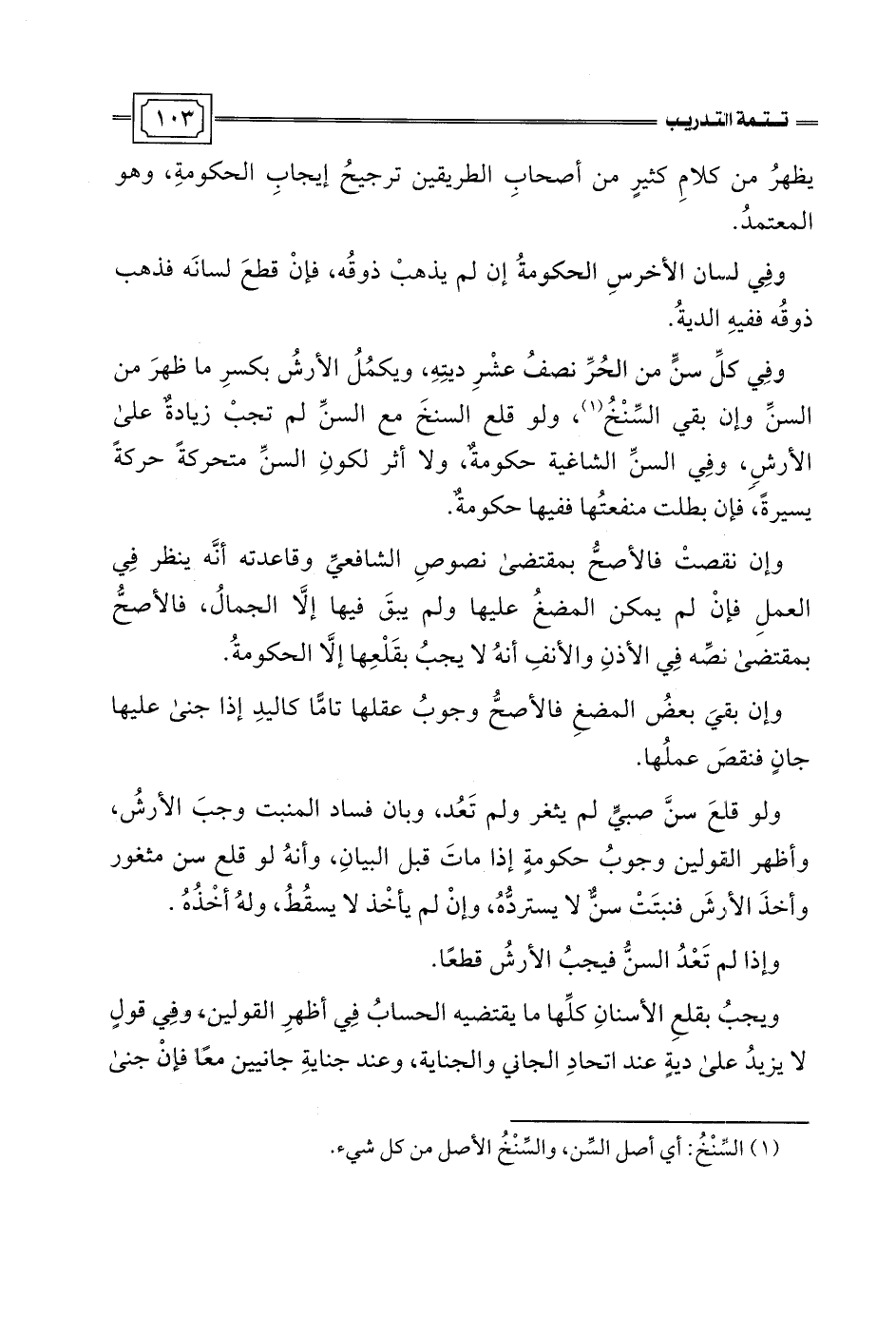 وفِي كلِّ سنٍّ من الحُرِّ نصفُ عشْرِ ديتِهِ، ويكمُلُ الأرشُ بكسرِ ما ظهرَ من السنِّ وإن بقي السِّنْخُ (¬1)، ولو قلع السنخَ مع السنِّ لم تجبْ زيادةٌ على الأرشٍ، وفِي السنِّ الشاغية حكومةٌ، ولا أثر لكونِ السنِّ متحركةً حركةً يسيرةً، فإن بطلت منفعتُها ففيها حكومةٌ.