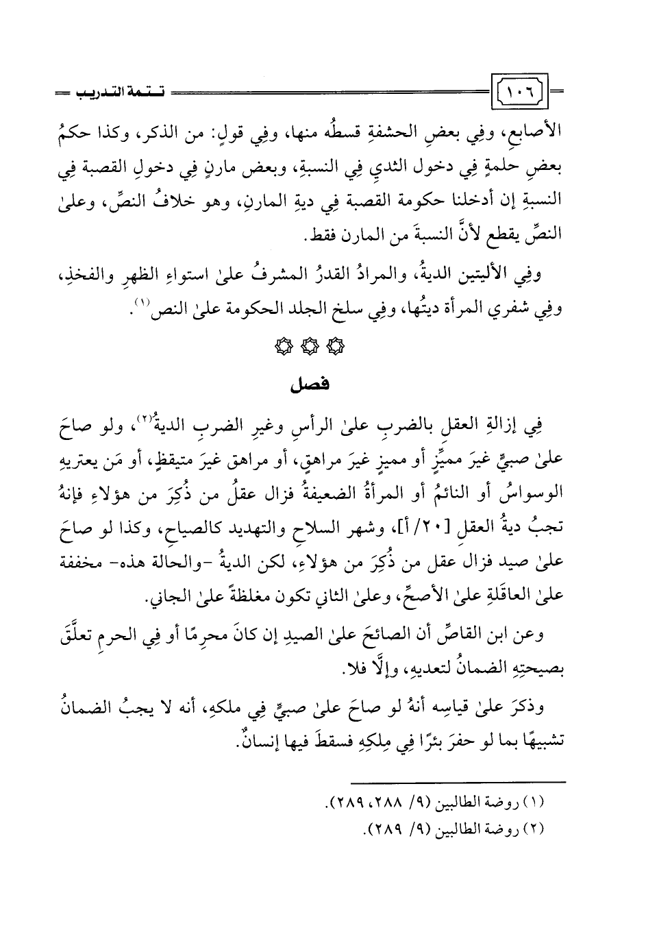 في إزالةِ العقل بالضربِ على الرأسِ وغيرِ الضربِ الديةُ (¬2)، ولو صاحَ على صبيٍّ غيرَ مميِّزٍ أو مميزٍ غيرَ مراهقٍ، أو مراهق غيرَ متيقظٍ، أو مَن يعتريهِ الوسواسُ أو النائمُ أو المرأةُ الضعيفةُ فزال عقلُ من ذُكِرَ من هؤلاءِ فإنهُ تجبُ ديةُ العقلِ، وشهر السلاحِ والتهديد كالصياحِ، وكذا لو صاحَ على صيد فزال عقل من ذُكِرَ من هؤلاءِ، لكن الديةُ -والحالة هذه- مخففة على العاقَلةِ على الأصحِّ، وعلى الثاني تكون مغلظةً على الجاني.