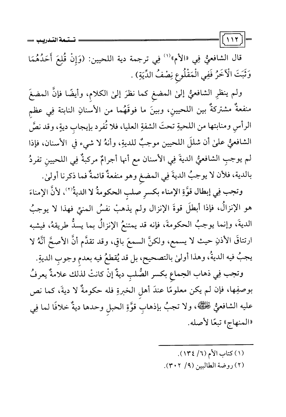 ولم ينظرِ الشافعيُّ إلى المضغِ كم انظرَ إلى الكلامِ، وأيضًا فإنَّ المضغَ منفعةٌ مشتركةٌ بين اللحيينِ، وبينَ ما فوقَهُما من الأسنانِ النابتة في عظمِ الرأسِ ومنابتها من اللحيةِ تحتَ الشفةِ العليا، فلا تُفرد بإيجابِ ديةٍ، وقد نصَّ الشافعيُّ على أن شللَ اللحيين موجبٌ للديةِ، وأنهُ لا شيء في الأسنان، فإذا لم يوجبِ الشافعيُّ الديةَ في الأسنان مع أنها أجرامٌ مركبةٌ في اللحيينِ تفردُ بالدية، فلأن لا يوجبُ الديةَ في المضغِ وهو منفعةٌ قائمةٌ فما ذكرنا أولى.