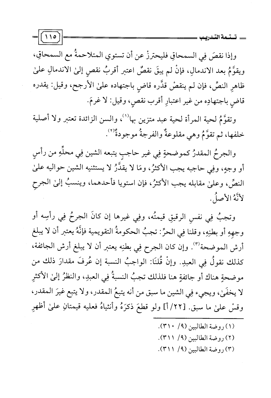 وإذا نقصَ في السمحاقِ فليحترزْ عن أن تستوي المتلاحمةُ مع السمحاقِ، ويقوَّمُ بعد الاندمال، فإنْ لم يبقَ نقصٌ اعتبر أقربُ نقصٍ إلى الاندمالِ على ظاهرِ النصِّ، فإن لم ينقصْ قدَّره قاضٍ باجتهاده على الأرجح، وقيل: يقدره قاضٍ باجتهادِه من غير اعتبارِ أقرب نقصٍ، وقيل: لا غرمَ.