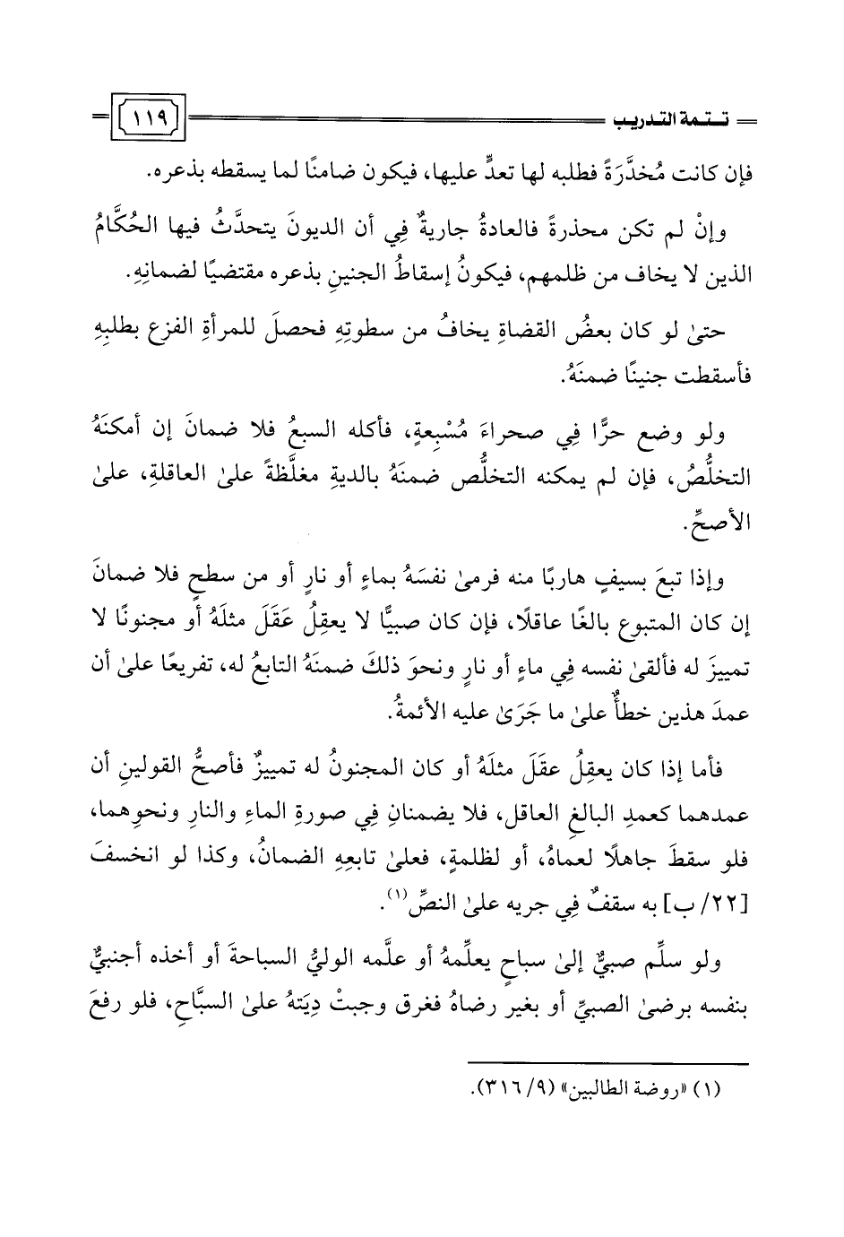 وإنْ لم تكن محذرةً فالعادةُ جاريةٌ في أن الديونَ يتحدَّثُ فيها الحُكَّامُ الذين لا يخاف من ظلمهم، فيكونُ إسقاطُ الجنينِ بذعره مقتضيًا لضمانِهِ.