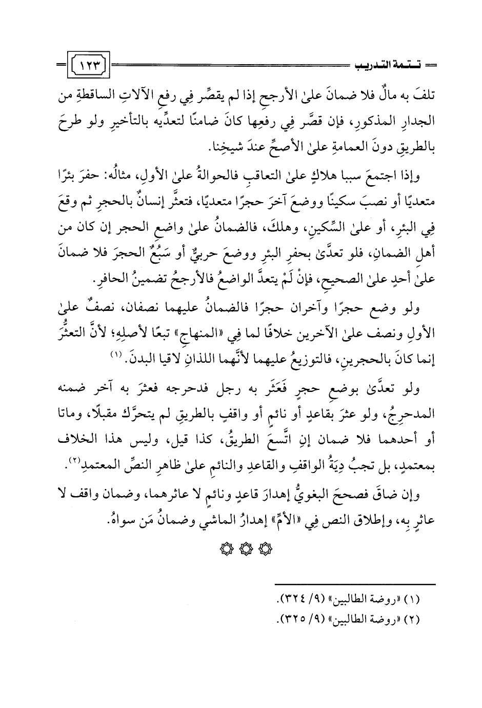 وإذا اجتمعَ سببا هلاكٍ على التعاقبِ فالحوالةُ على الأولِ، مثالُه: حفرَ بئرًا متعديًا أو نصبَ سكينًا ووضعَ آخرَ حجرًا متعديًا، فتعثَّر إنسانٌ بالحجرِ ثم وقعَ في البئرِ، أو على السِّكينِ، وهلكَ، فالضمانُ على واضعِ الحجر إن كان من أهلِ الضمانِ، فلو تعدَّى بحفرِ البئرِ ووضعَ حربيٌّ أو سَبُع الحجرَ فلا ضمانَ على أحدٍ على الصَّحيحِ، فإنْ لَمْ يتعدَّ الواضعُ فالأرجحُ تضمينُ الحافرِ.