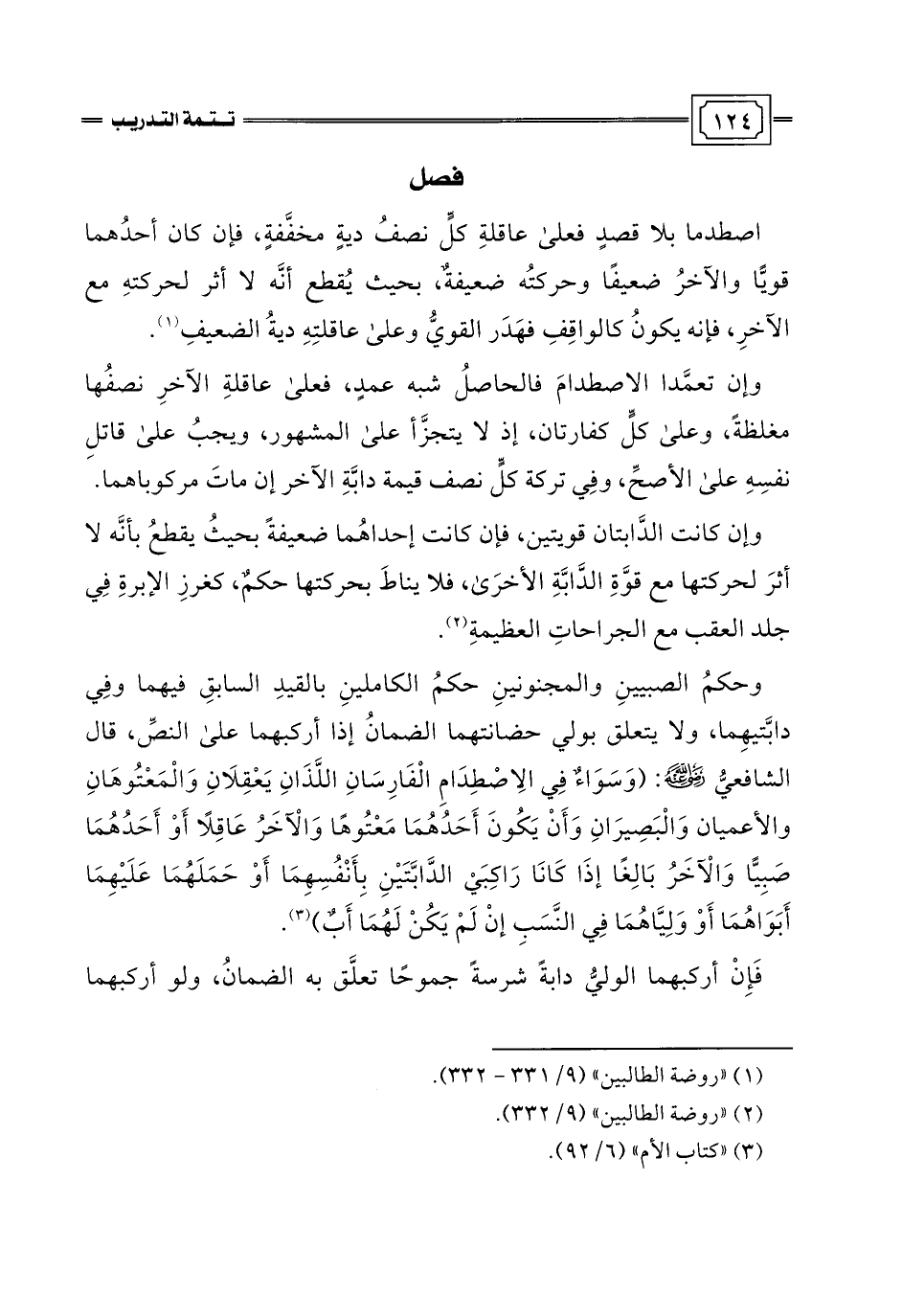 وحكمُ الصبيينِ والمجنونينِ حكمُ الكاملينِ بالقيدِ السابقِ فيهما وفِي دابَّتيهِما، ولا يتعلق بولي حضانتهما الضمانُ إذا أركبهما على النصِّ، قال الشافعيُّ -رضي اللَّه عنه-: (وَسَوَاءٌ في الِاصْطِدَامِ الْفَارِسَانِ اللَّذَانِ يَعْقِلَانِ وَالْمَعْتُوهَانِ والأعميان وَالْبَصِيرَانِ وَأَنْ يَكُونَ أَحَدُهُمَا مَعْتُوهًا وَالْآخَرُ عَاقِلًا أَوْ أَحَدُهُمَا صَبِيًّا وَالآخَرُ بَالِغًا إذَا كَانَا رَاكِبَي الدَّابَّتَيْنِ بِأَنْفُسِهِمَا أَوْ حَمَلَهُمَا عَلَيْهِمَا أَبَوَاهُمَا أَوْ وَلِيَّاهُمَا في النَّسَبِ إنْ لَمْ يَكُنْ لَهُمَا أَبٌ) (¬3).