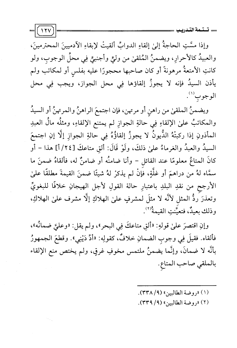ويضمنُ الملقى من راهنٍ أو مرتهن، فإن اجتمعَ الراهنُ والمرتهنُ أو السيدُ والمكاتبُ على الإلقاءِ في حالةِ الجوازِ لم يمتنع الإلقاءِ، ومثلُه مالُ العبدِ المأذونِ إذا ركبتْهُ الدُّيونُ لا يجوزُ إلقاؤُهُ في حالةِ الجوازِ إلَّا إنِ اجتمعَ السيدُ والعبدُ والغرماءُ على ذلكَ، ولَوْ قَالَ: ألقِ متاعكَ، هذا -أو كانَ المتاعُ معلومًا عند القائلِ- وأنا ضامنُه أو ضامن له، فألقاهُ ضمنَ ما سمَّاه لهُ من دراهمَ أو غلَّةٍ، فإنْ لم يذكرْ لهُ شيئًا ضمنَ القيمةَ مطلقًا على الأرجحِ من نقدِ البلدِ باعتبارِ حالة القولِ لأجل الهيجانِ خلافًا للبغويِّ وتعذرَ ردُّ المثلِ لأنَّه لا مثلَ لمشرفٍ على الهلاكِ إلَّا مشرف على الهلاكِ، وذلك بعيدٌ، فتعيَّنتِ القيمةُ (¬2).