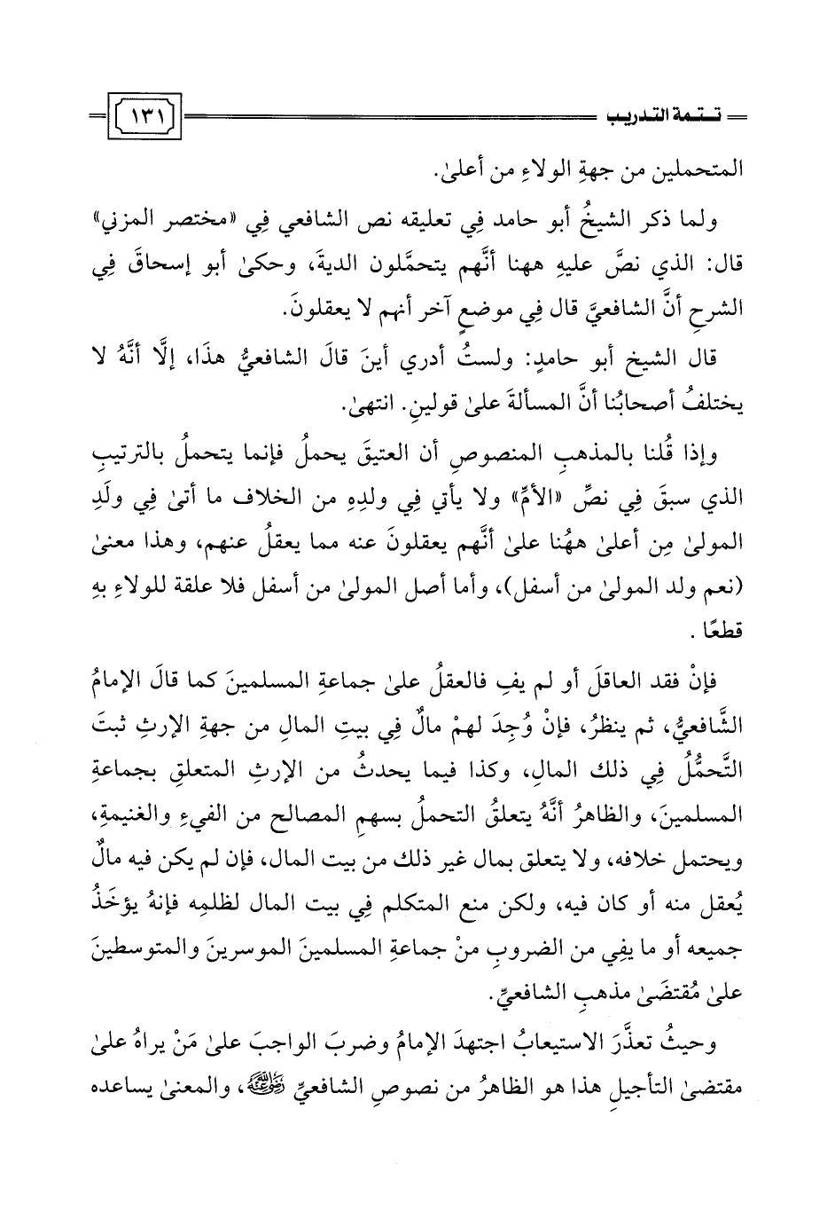 وإذا قُلنا بالمذهبِ المنصوصِ أن العتيقَ يحملُ فإنما يتحملُ بالترتيبِ الَّذي سبقَ في نصِّ "الأمِّ" ولا يأتي في ولدِهِ من الخلاف ما أتى في ولَدِ المولى مِن أعلى ههُنا على أنَّهم يعقلونَ عنه مما يعقلُ عنهم، وهذا معنى (نعم ولد المولى من أسفل)، وأما أصل المولى من أسفل فلا علقة للولاءِ بهِ قطعًا.